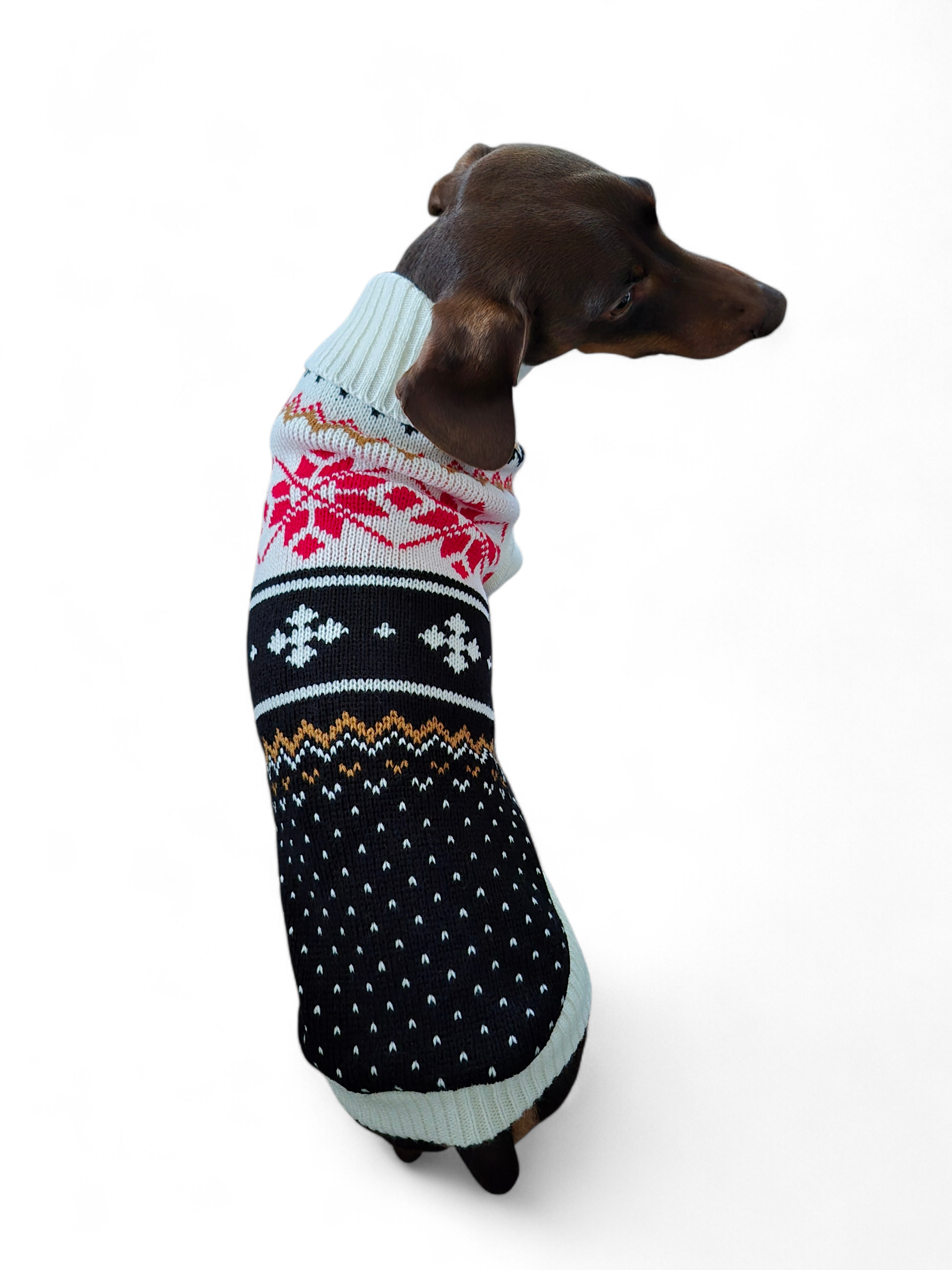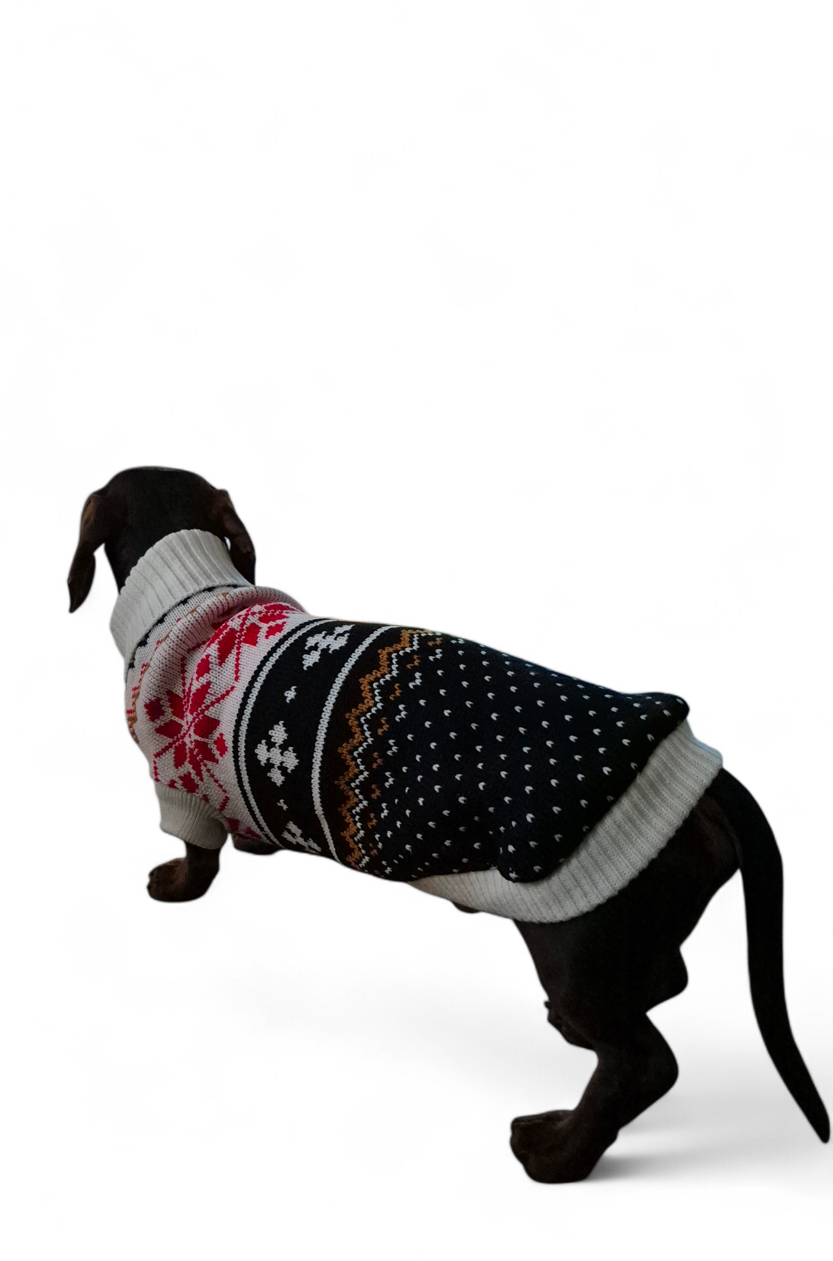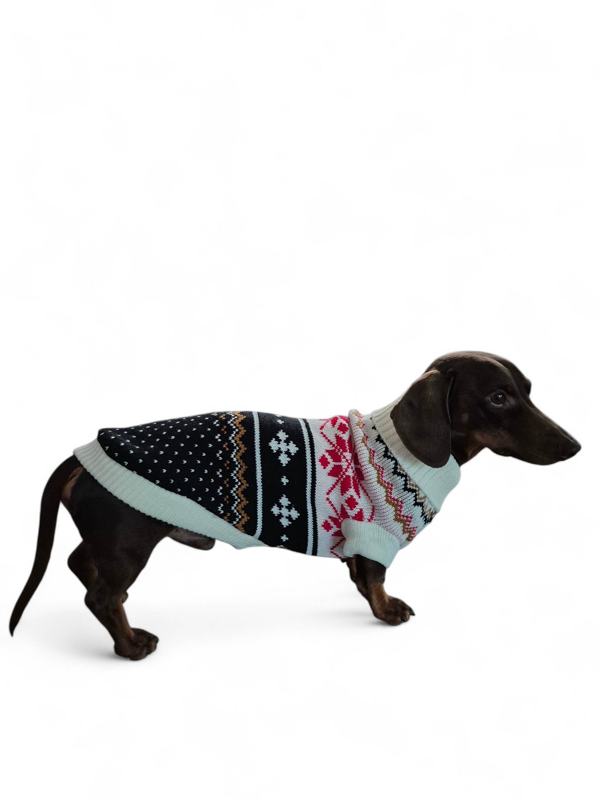 Deze mooie trui is door de smalle pasvorm zeer geschikt voor de slanke teckel. De trui is gemaakt van acryl en heeft een stijlvol patroon in verschillende kleuren (zwart/creme/rood/cognac).