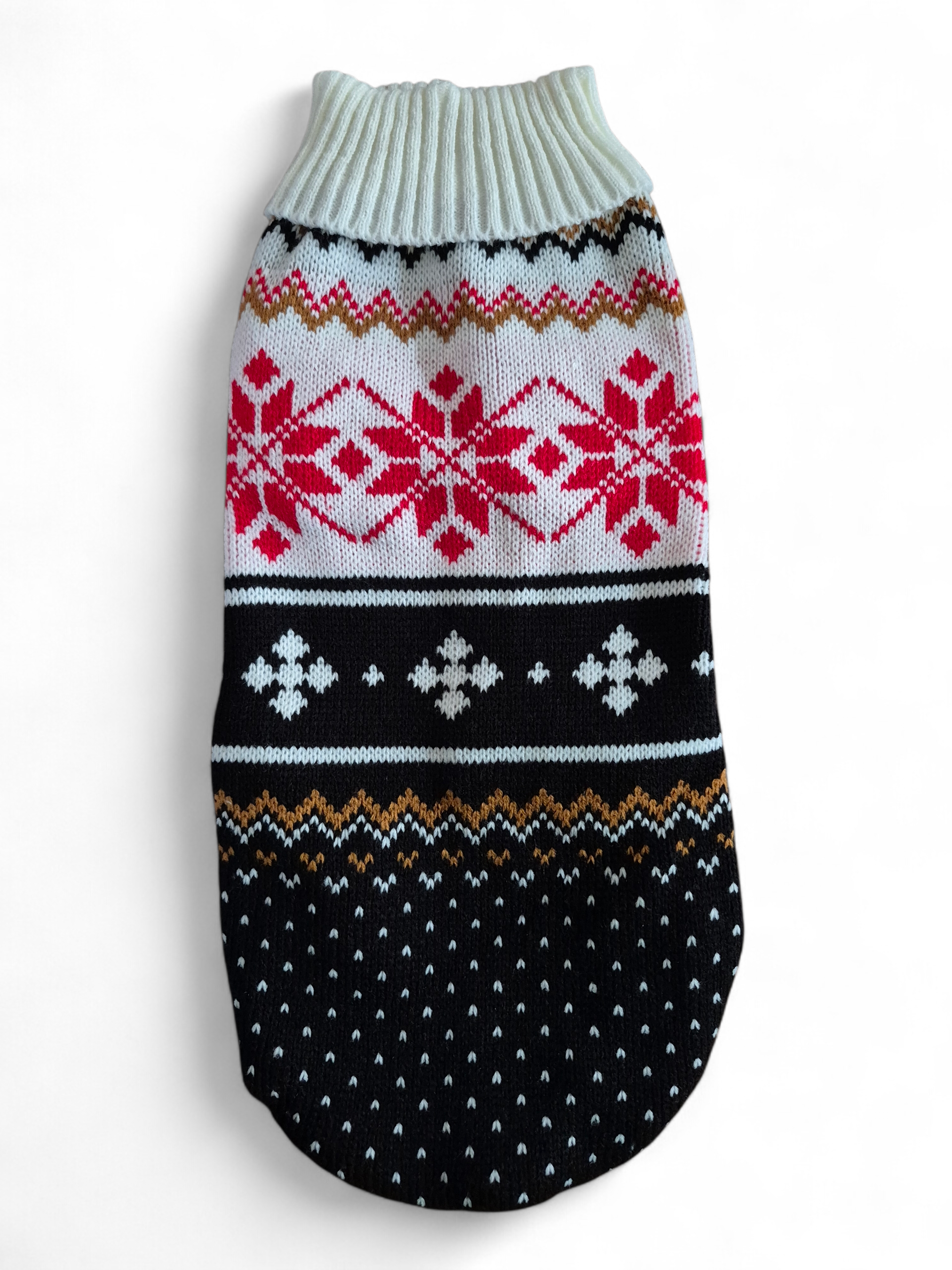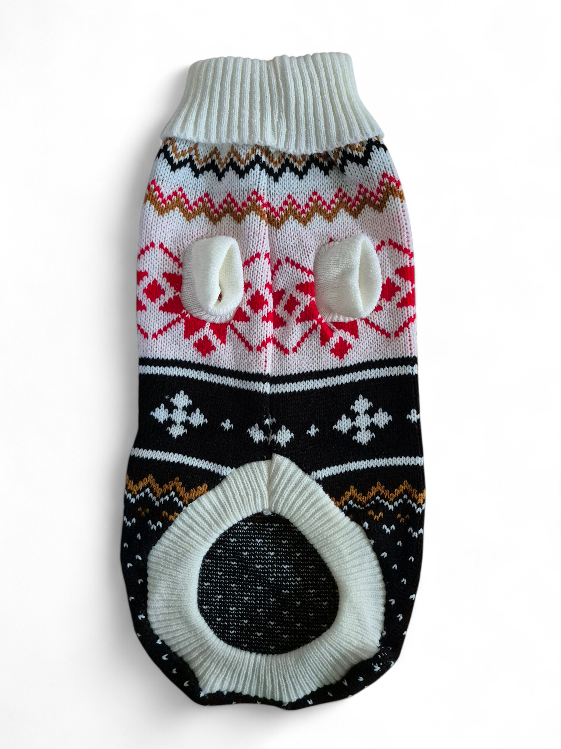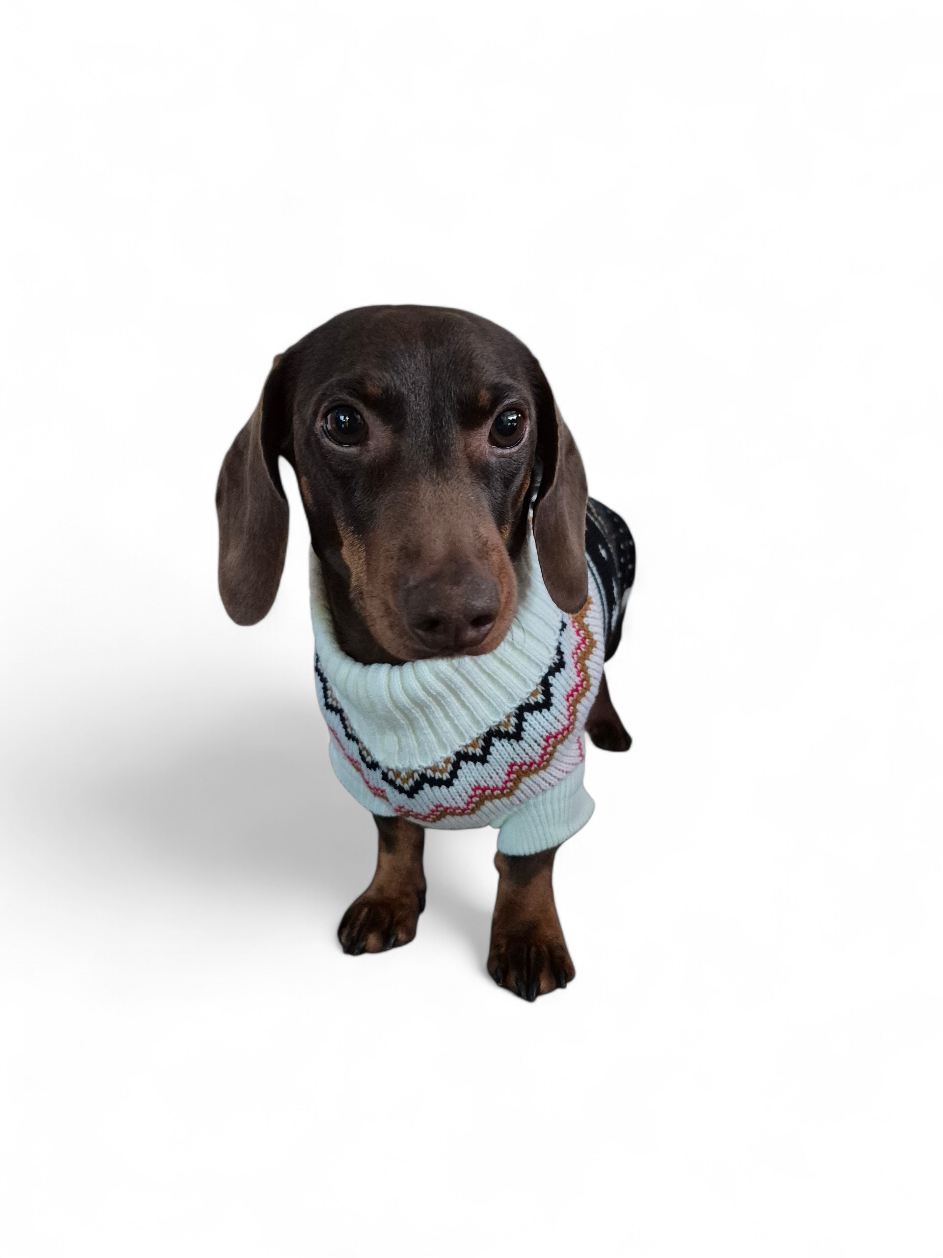 Deze mooie trui is door de smalle pasvorm zeer geschikt voor de slanke teckel. De trui is gemaakt van acryl en heeft een stijlvol patroon in verschillende kleuren (zwart/creme/rood/cognac).