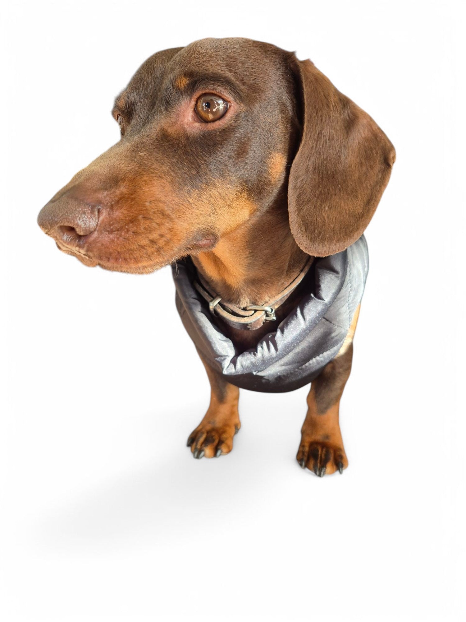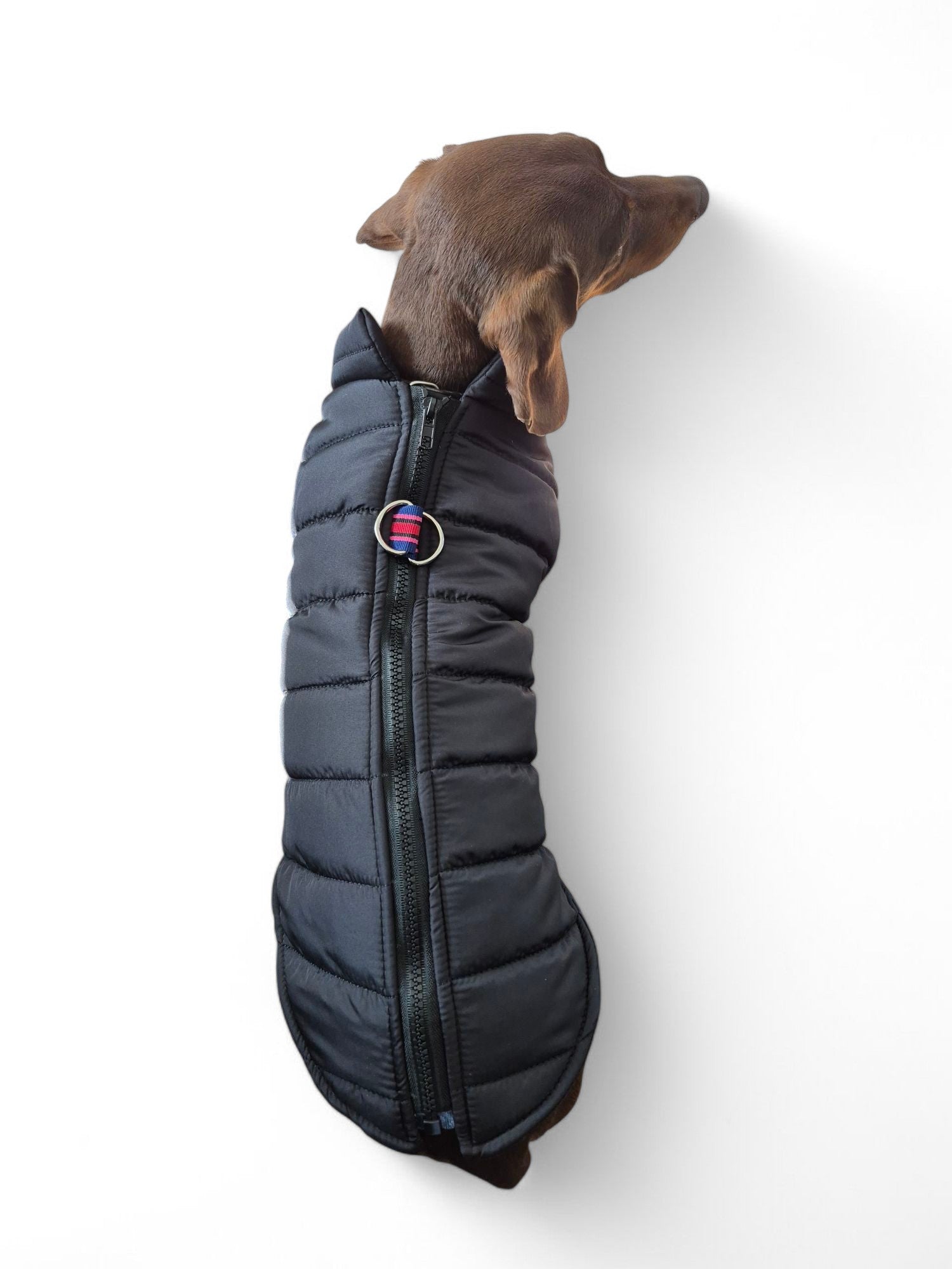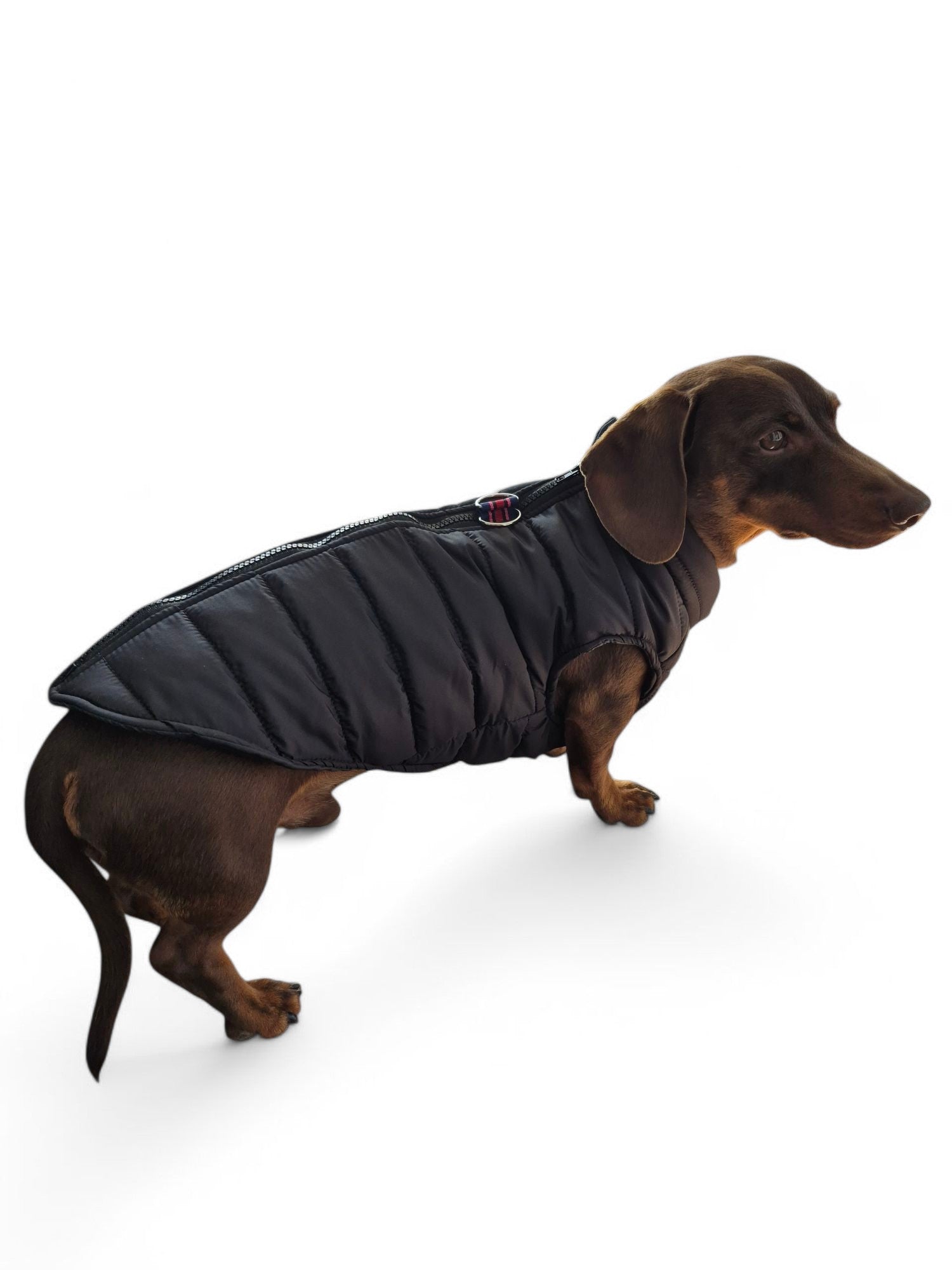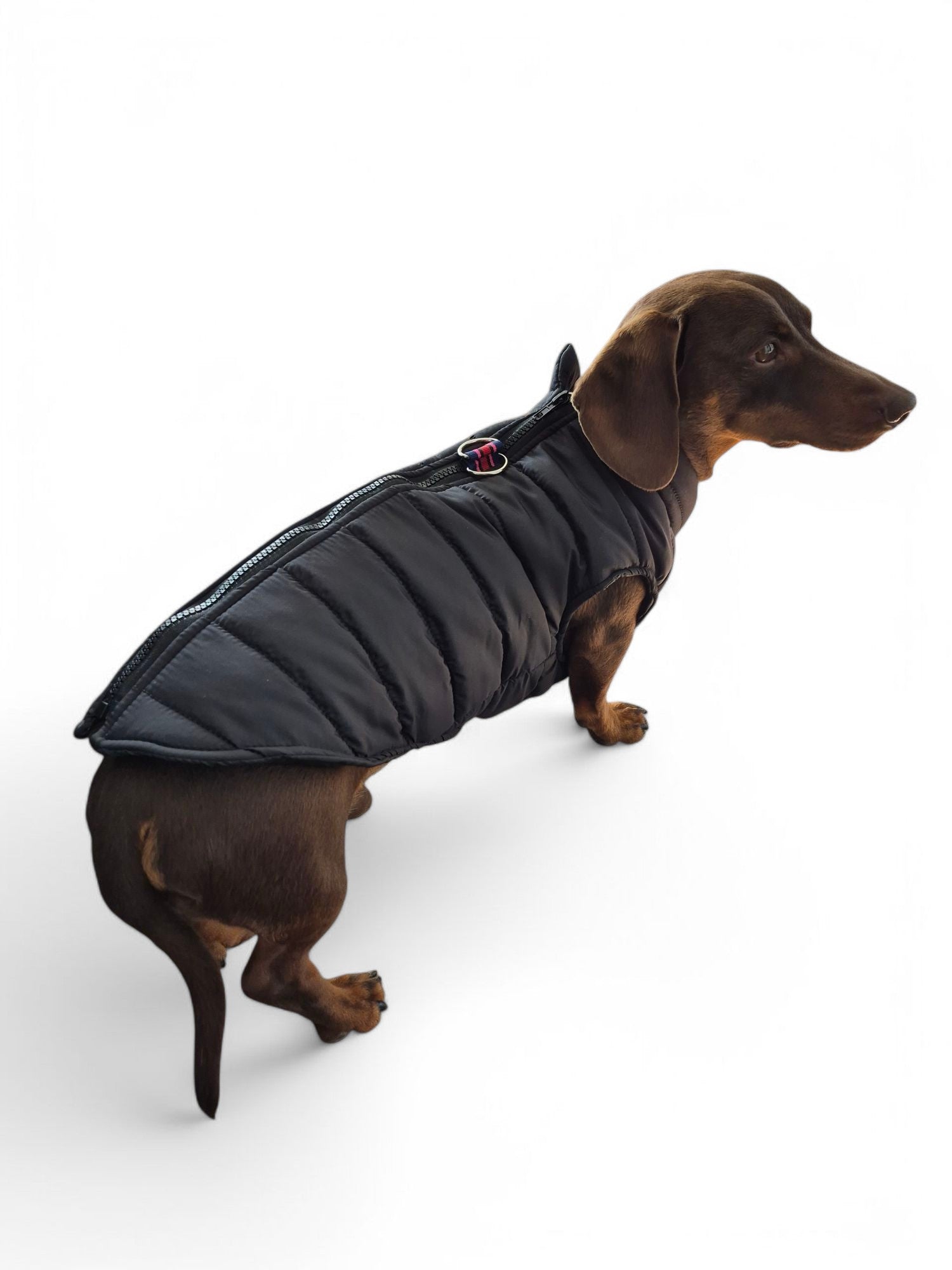 Deze leuke jas is er in drie kleuren: zwart, knalroze en middenblauw. De zachte stof sluit goed aan om het lijfje van je teckel. De jas is gemakkelijk aan en uit te trekken door de rits op de rug. Tevens zijn er haken bevestigd aan de jas, zodat je de lijn eraan kunt bevestigen.