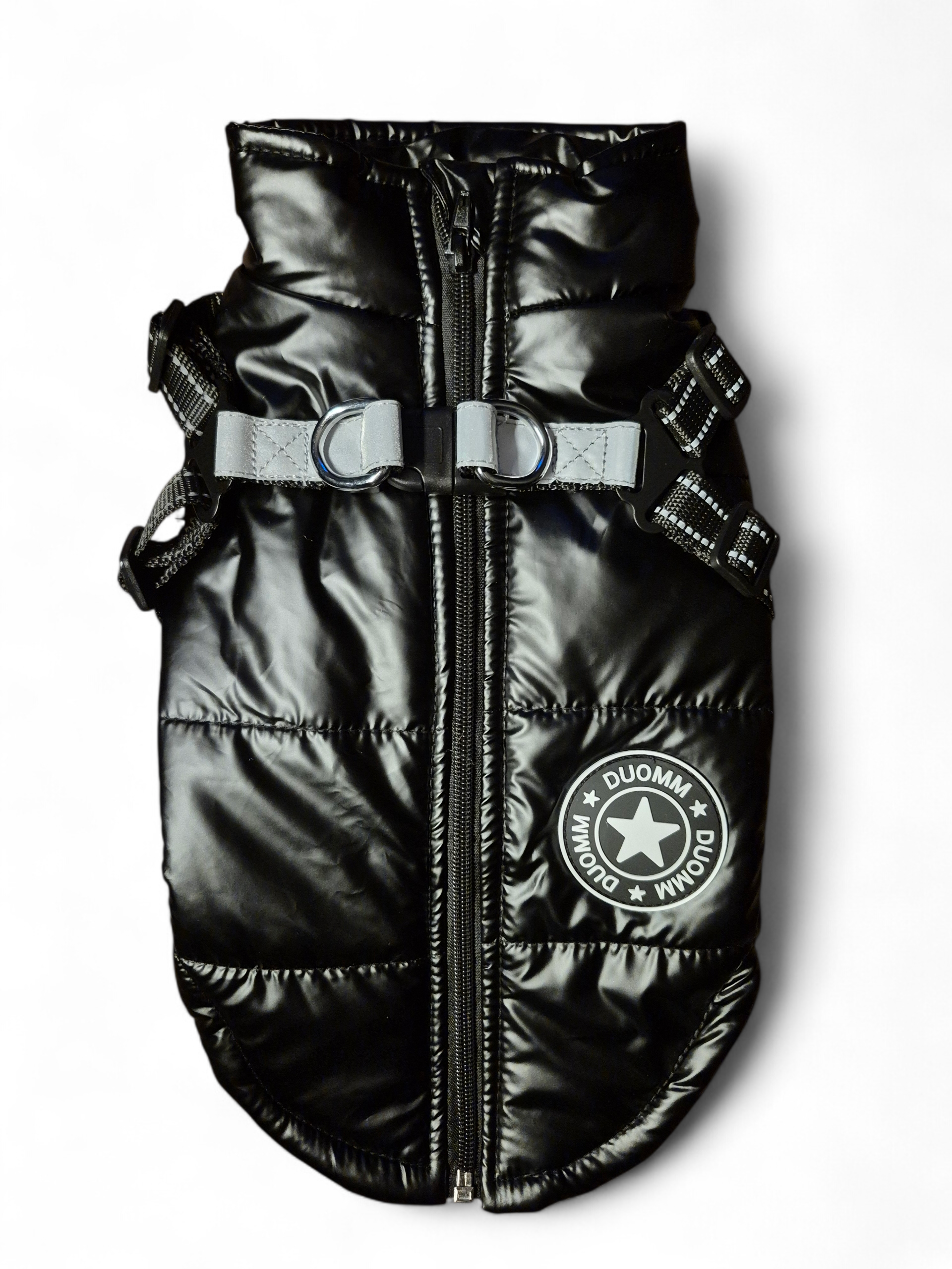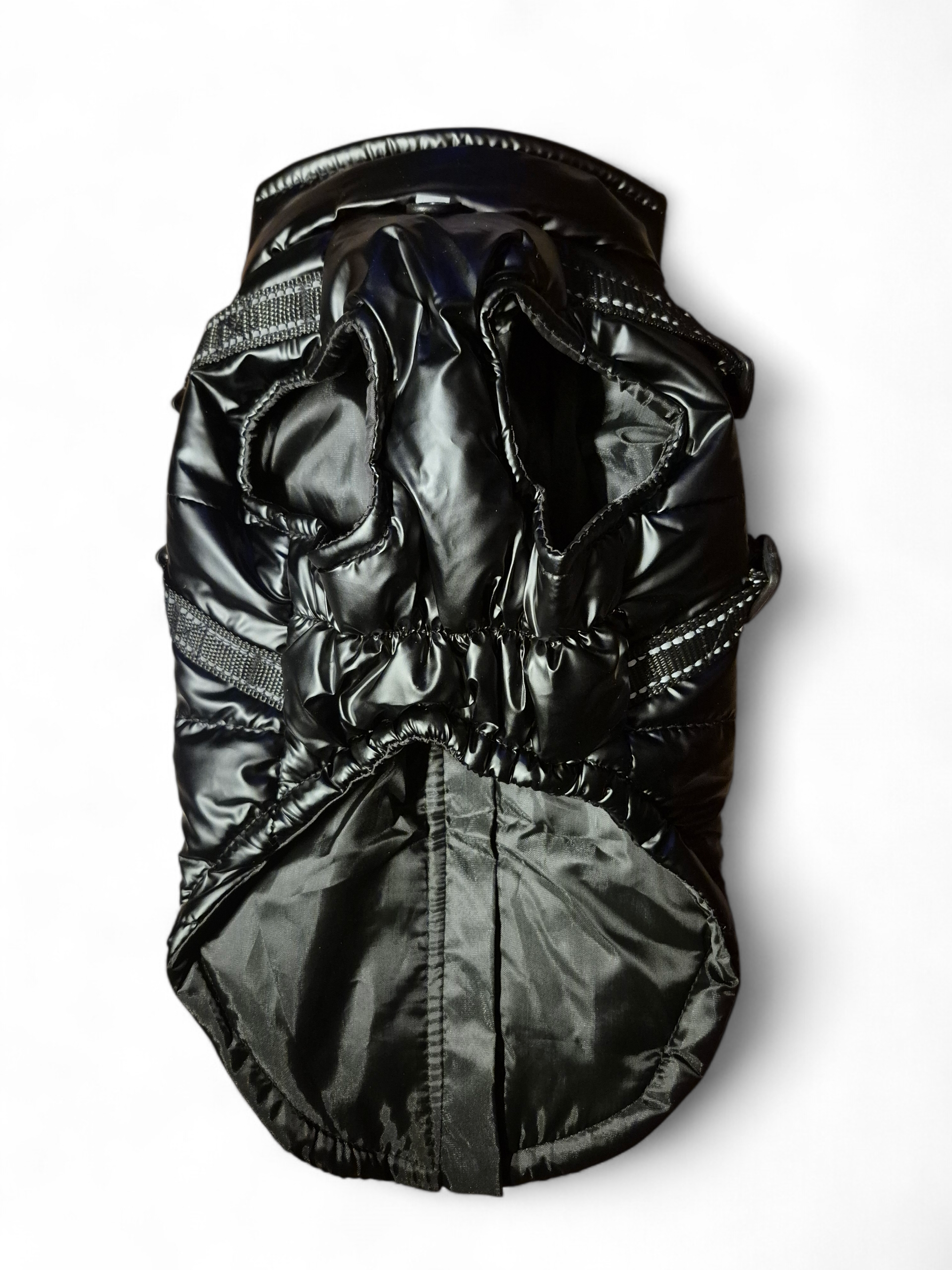 Uitgevoerd in glanzende, zwarte stof met geïntegreerd tuigje.