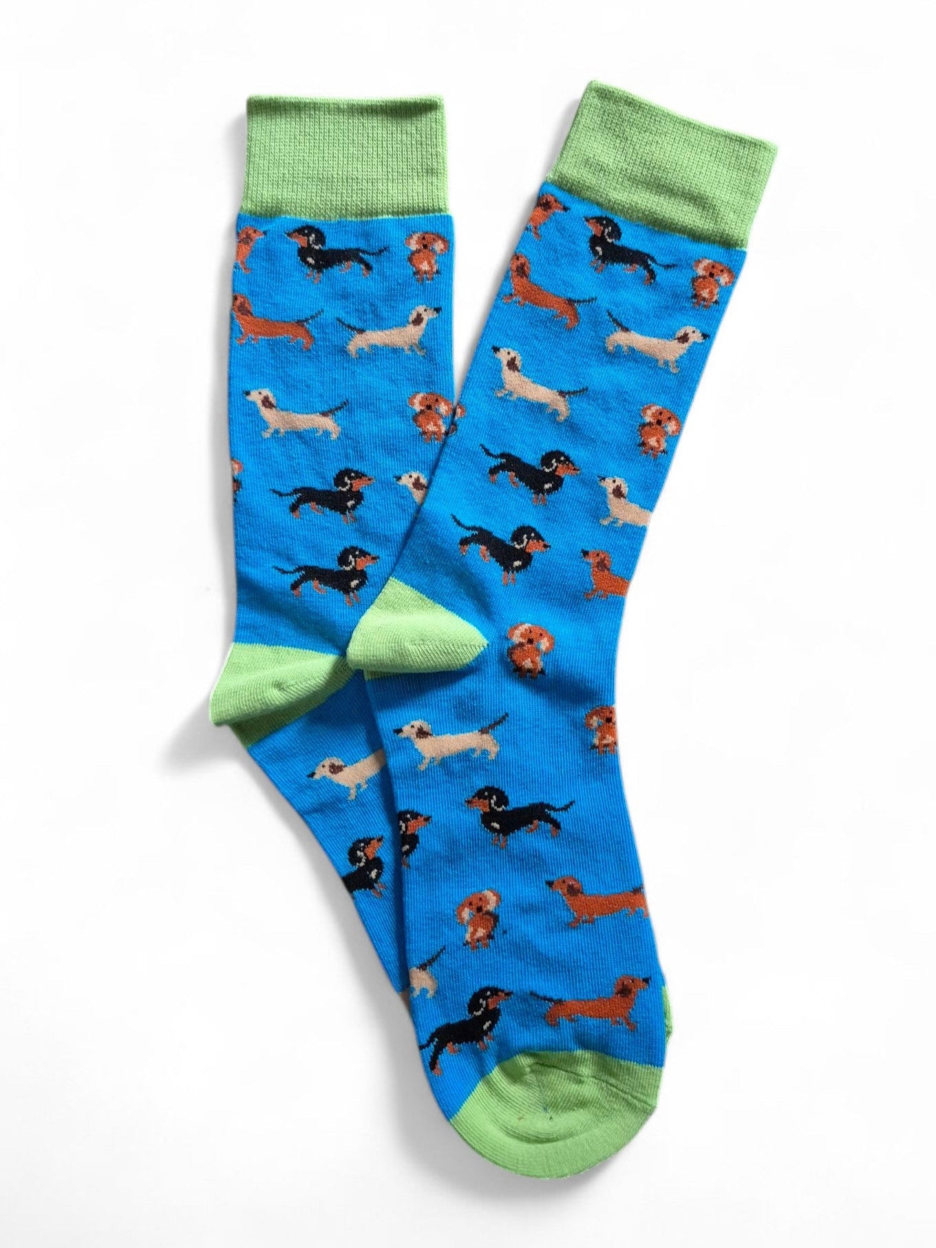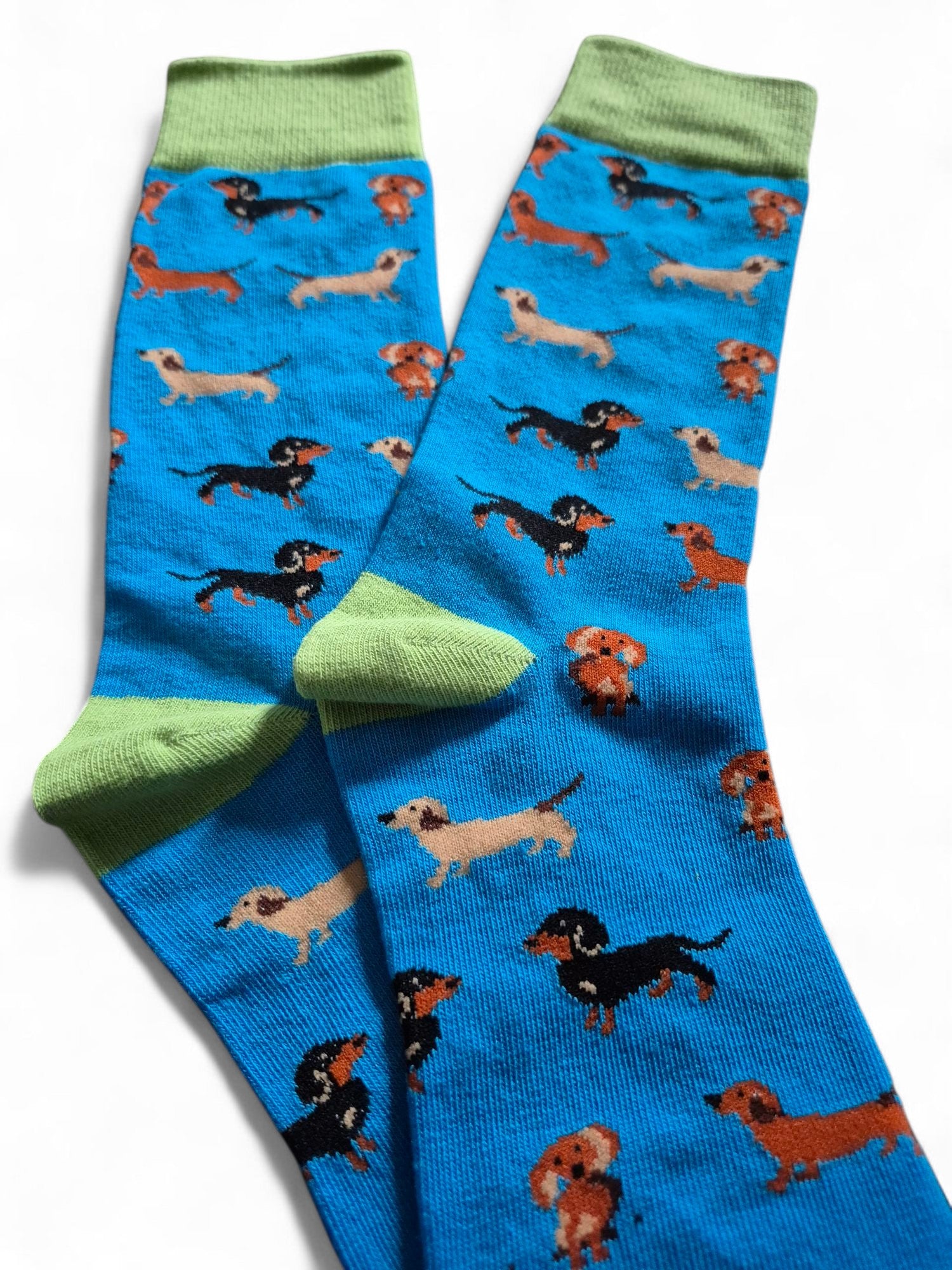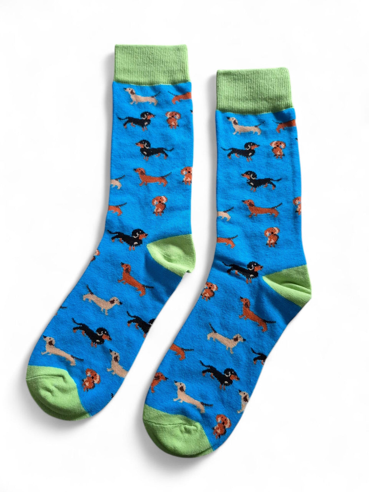 Deze grappige sokken met verschillende soorten teckels maken jouw outfit helemaal compleet. Verkrijgbaar in één model (blauw/groen) en één maat: 39-42.