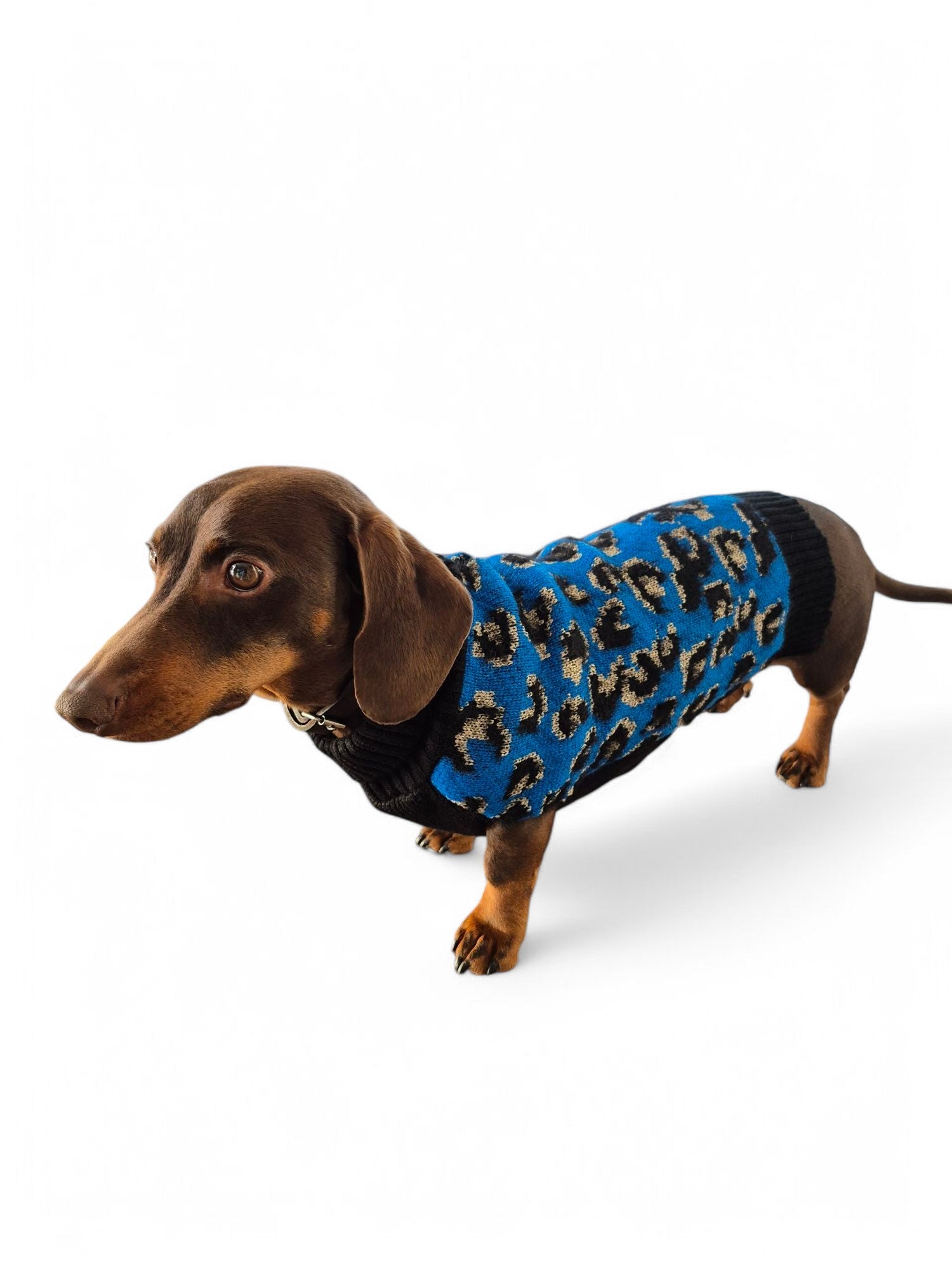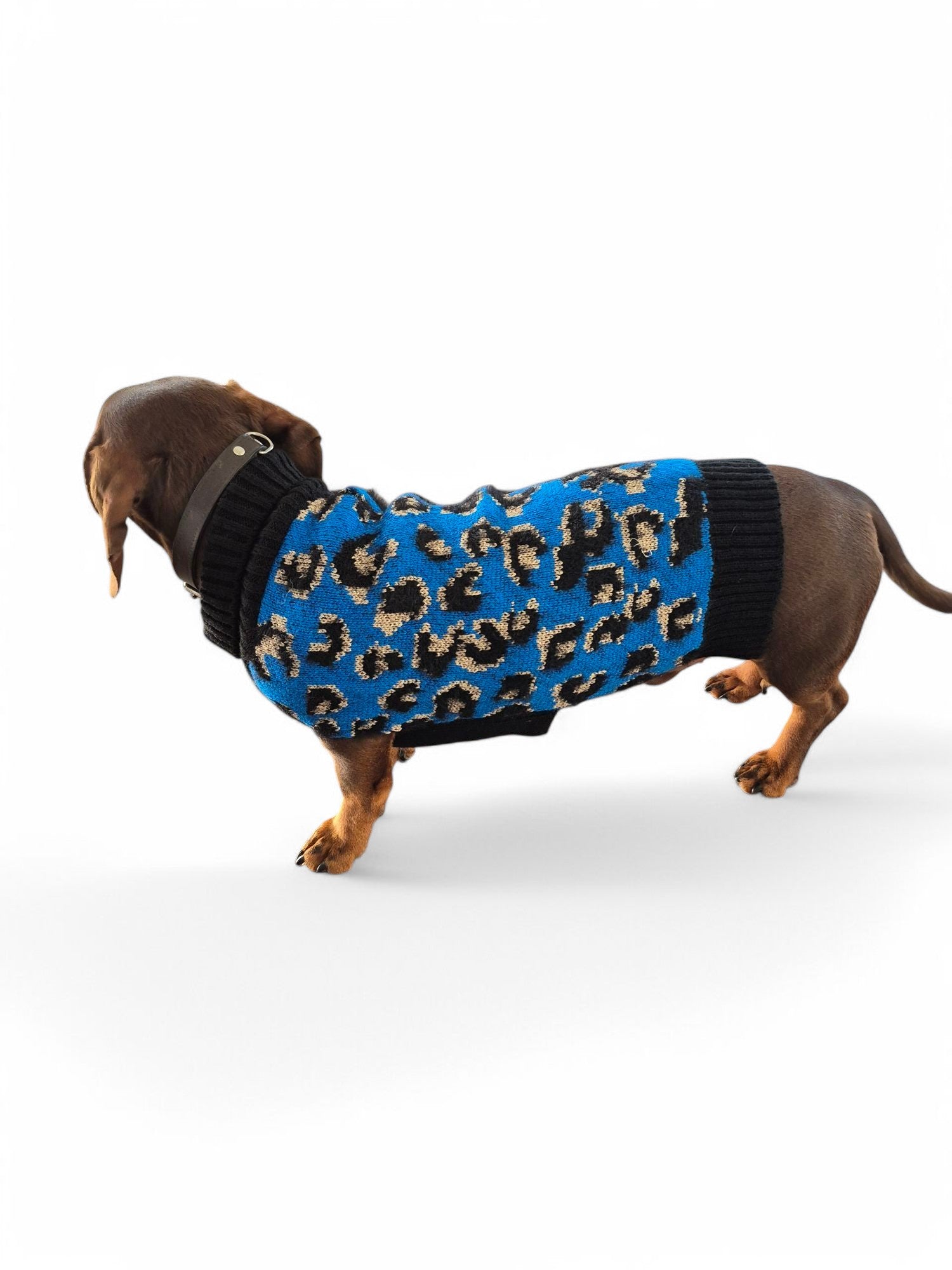 Dit gebreide truitje met luipaardpatroon is lekker opvallend. Daarnaast uiteraard ook heel functioneel om je teckel warm te houden op koudere dagen. Op de rug bevindt zich een opening waar je de lijn door kunt bevestigen. Verkrijgbaar in één kleur, voor (mini) kaninchens (ruglengte 30 cm) en kleinere dwergteckels (ruglengte 35 cm).