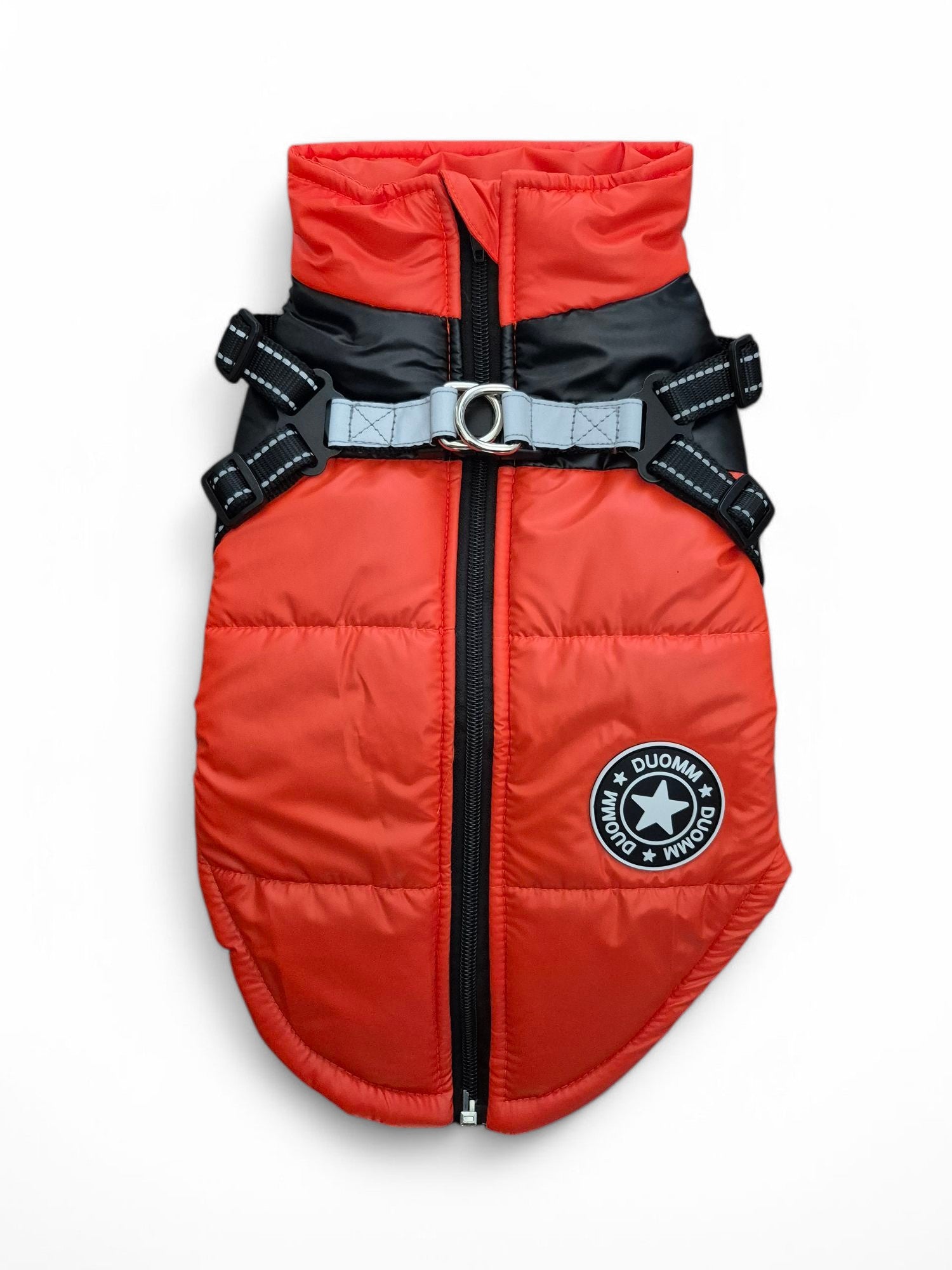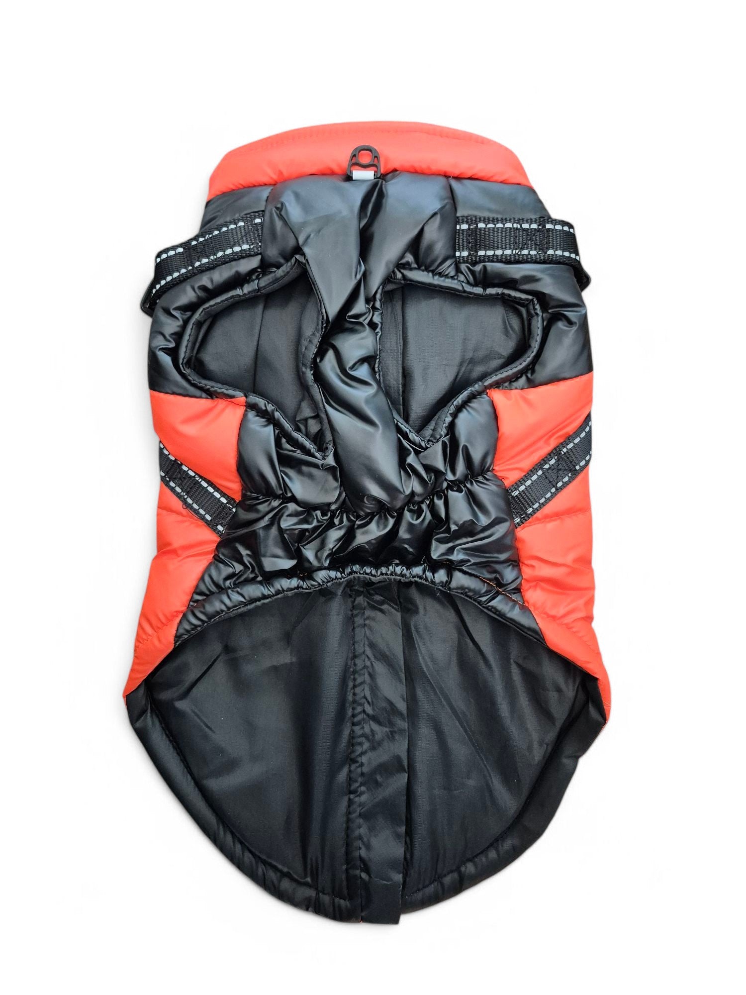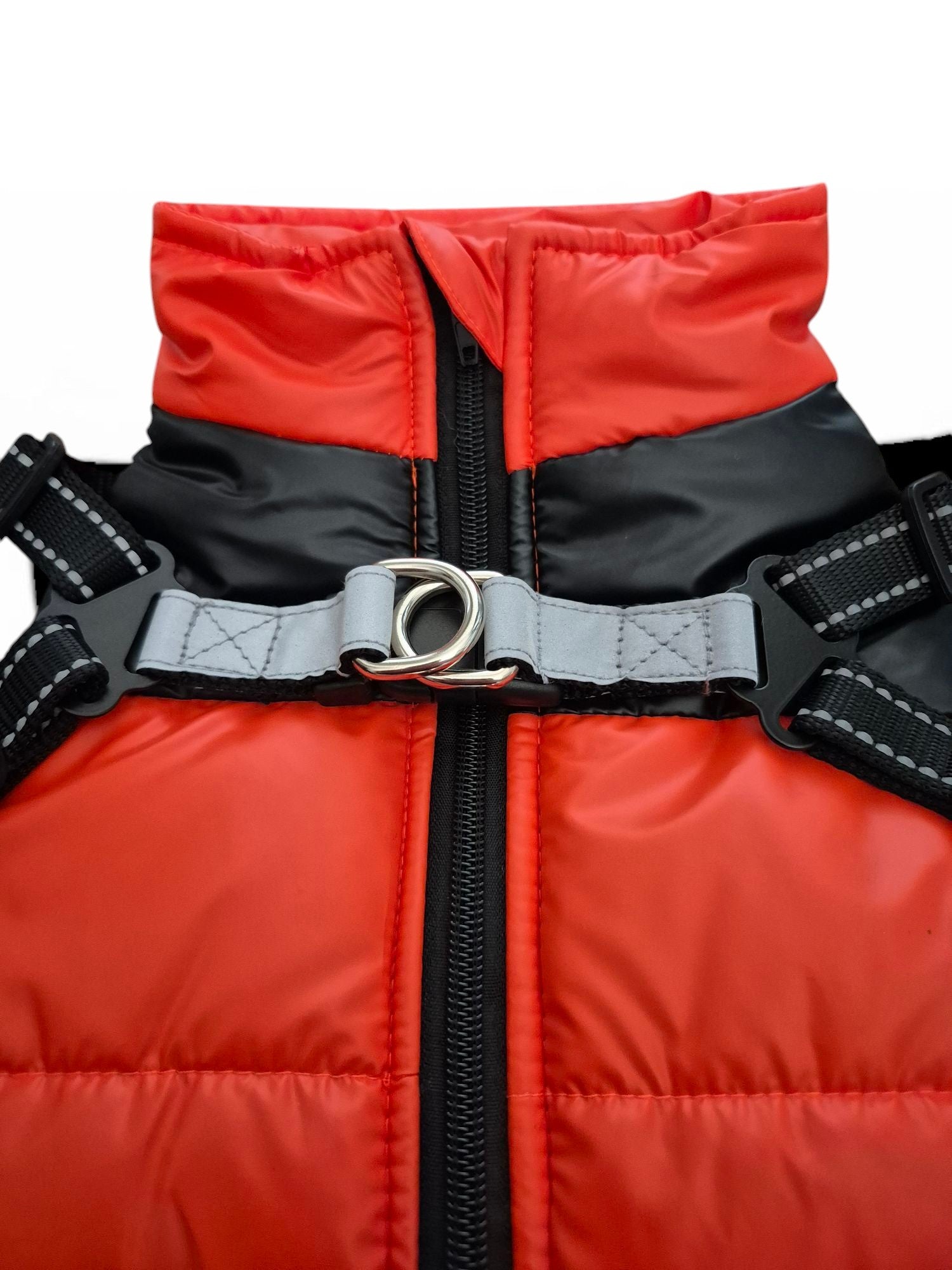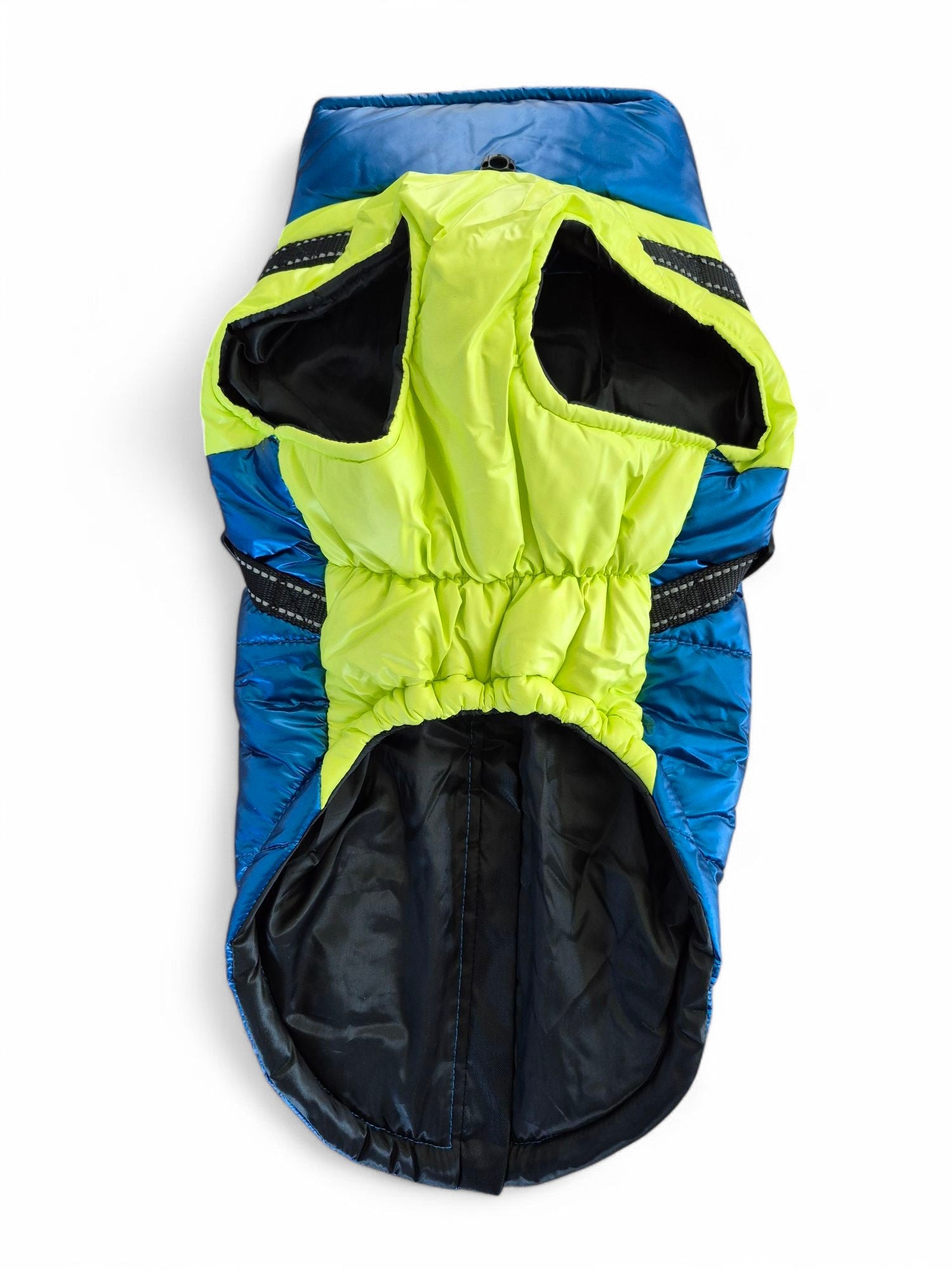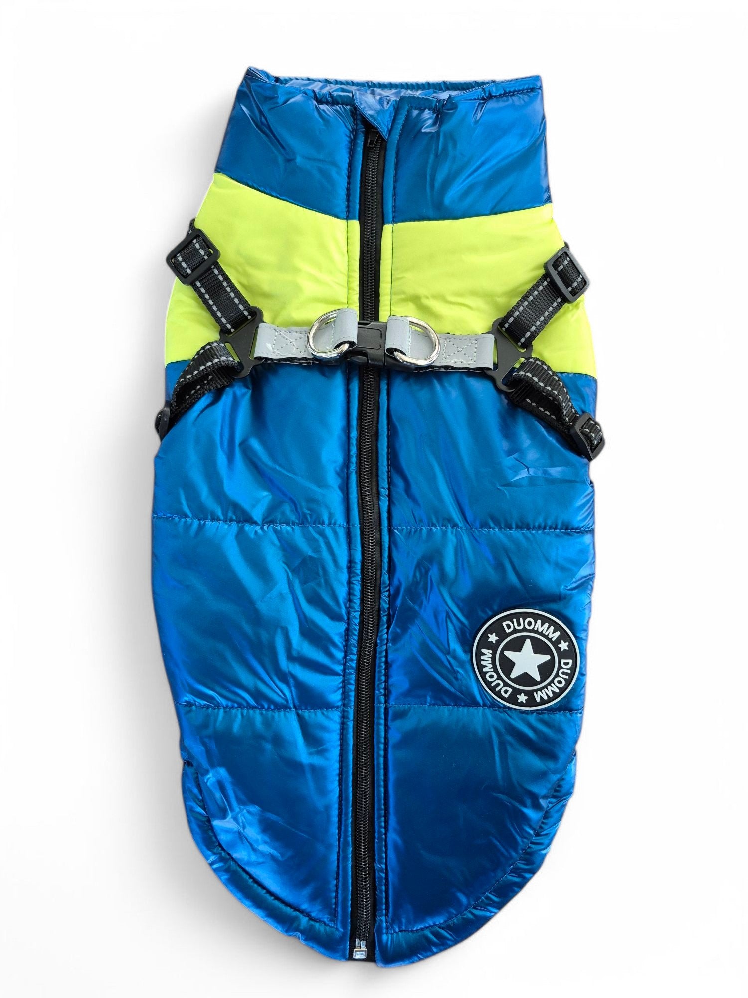 De jas is gemakkelijk aan en uit te trekken door de rits op de rug en bevat een stevig geïntegreerd tuig. Verkrijgbaar in blauw/groen en oranje/zwart (glanzende stof).