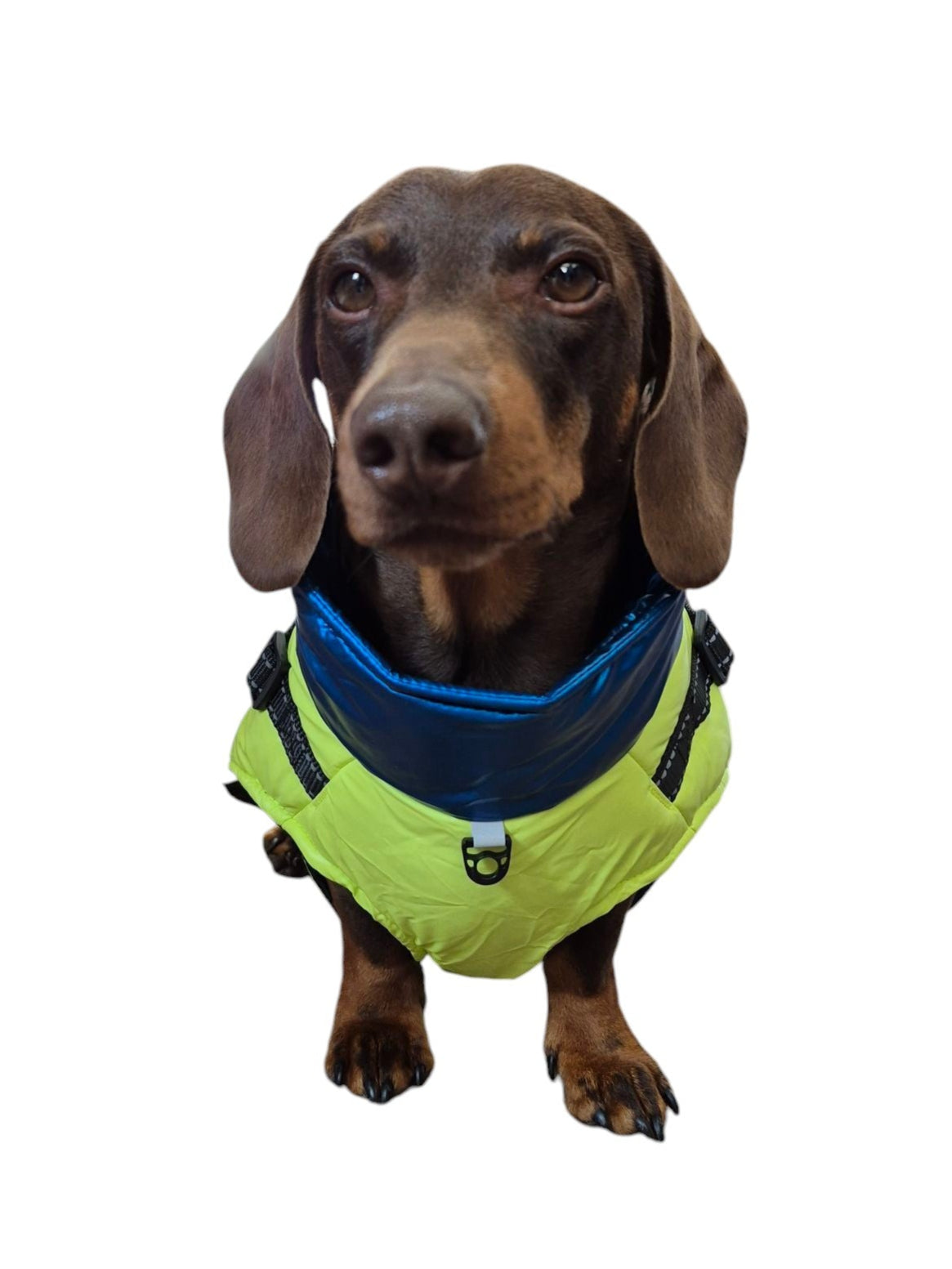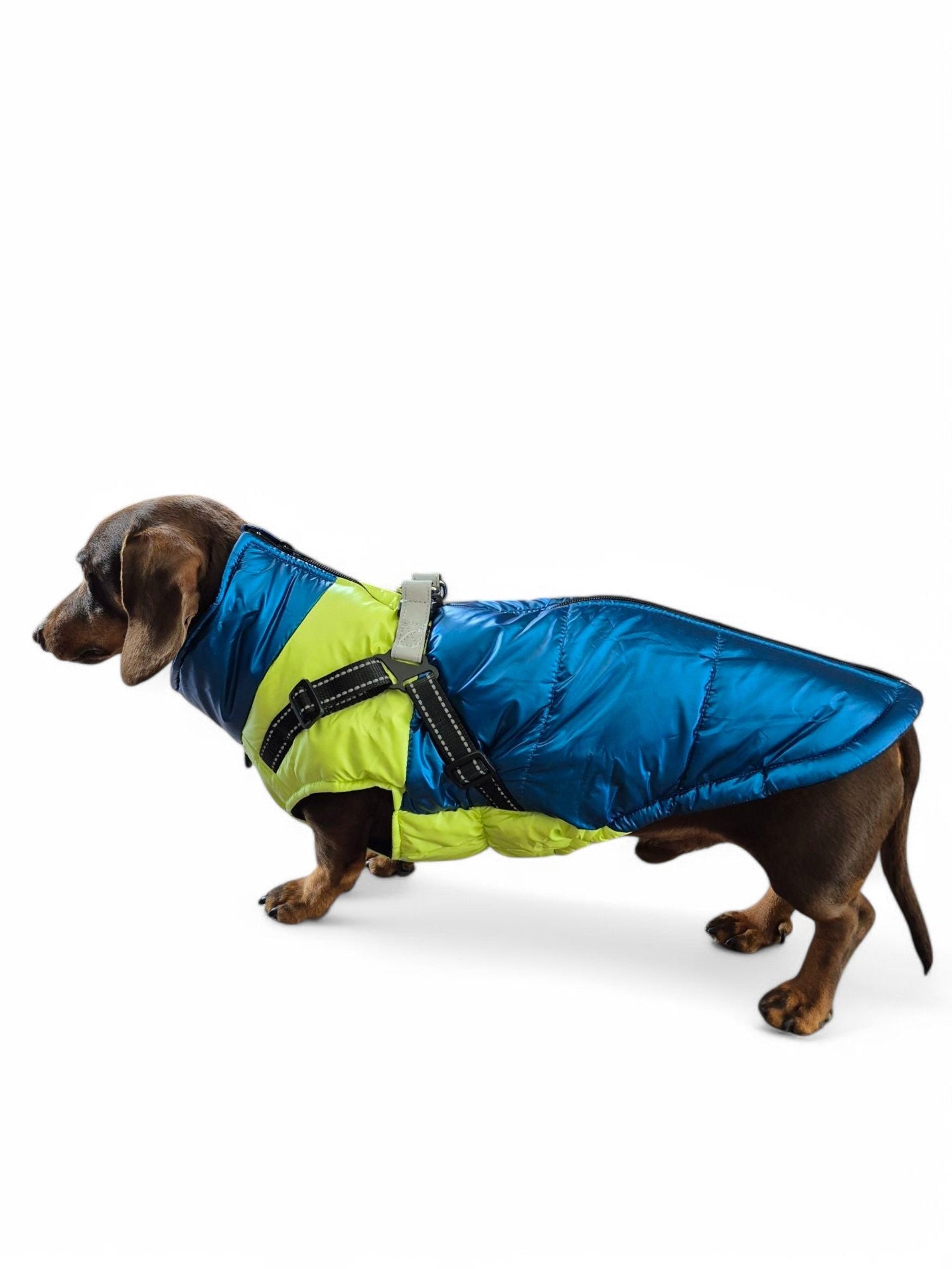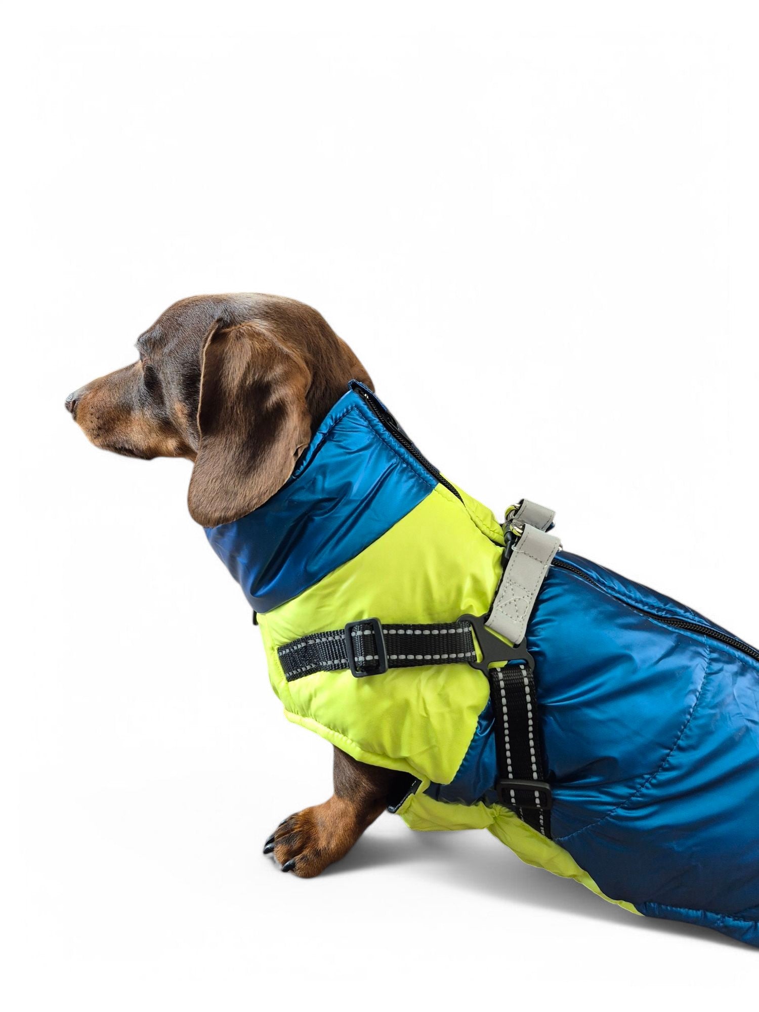Deze flitsende winterjas is perfect voor teckels die eigenlijk te groot (lang) zijn voor hun formaat, oftewel: "het zou eigenlijk een dwerg moeten zijn, maar hij is een slag groter". Of juist: "het is een standaard, maar hij is wel klein uitgevallen". Wanneer je teckel precies tussen twee formaten in valt, is deze jas een uitkomst. De jas valt in de breedte niet heel ruim, dus is niet geschikt voor teckels die wat voller zijn.