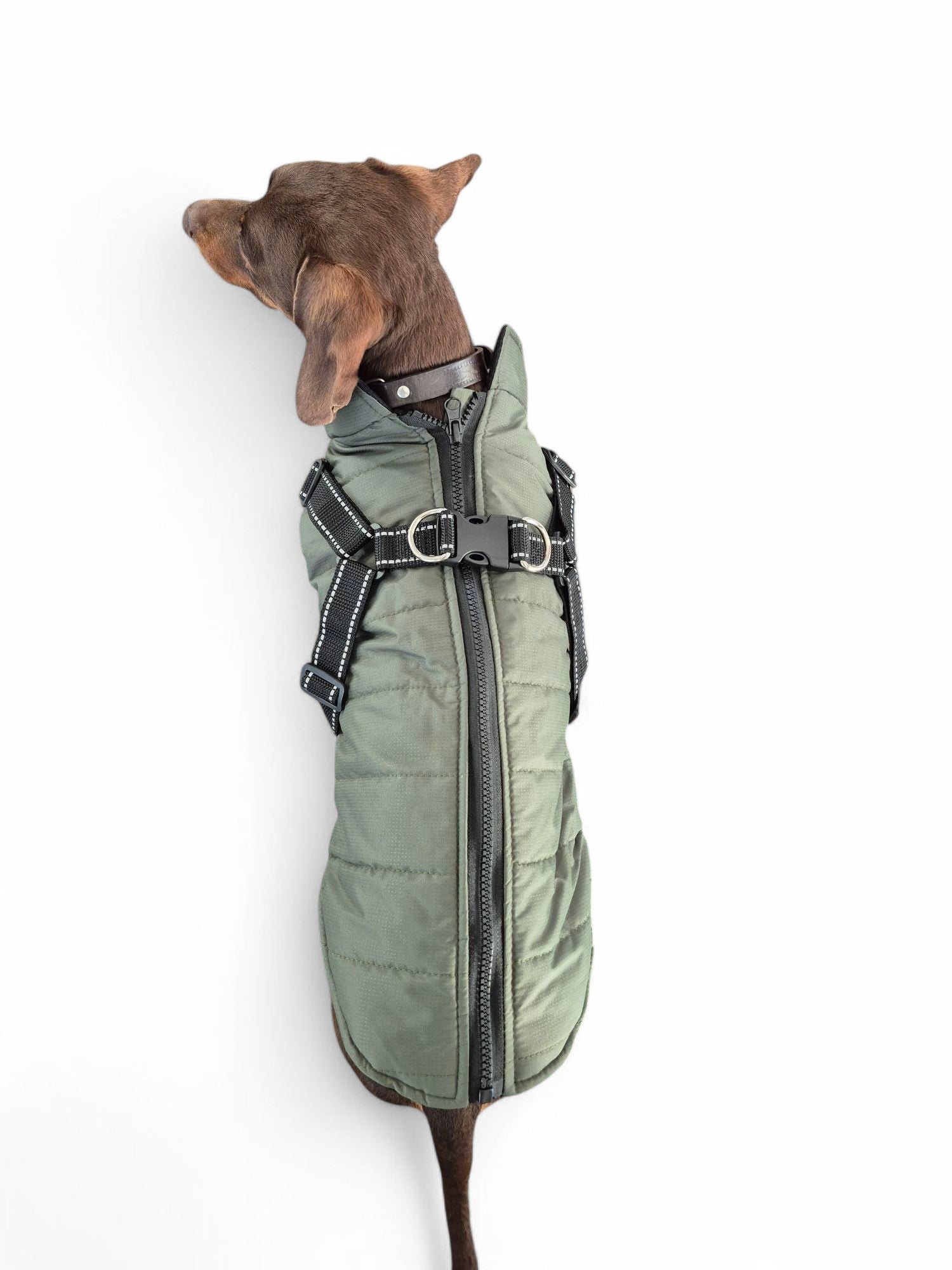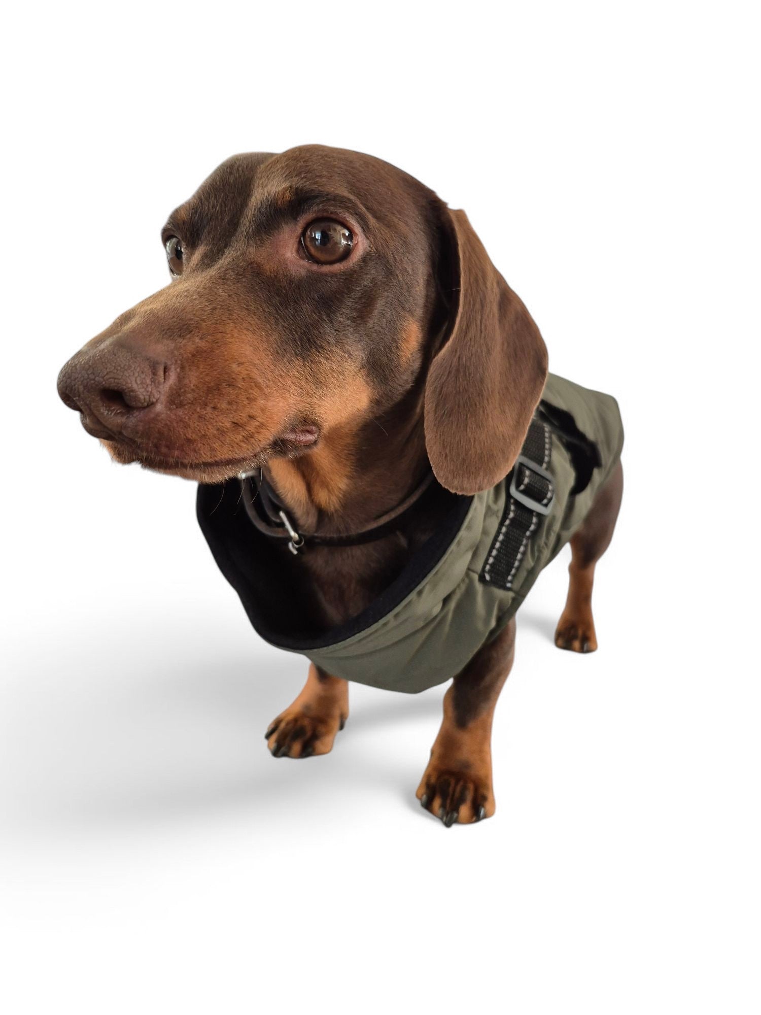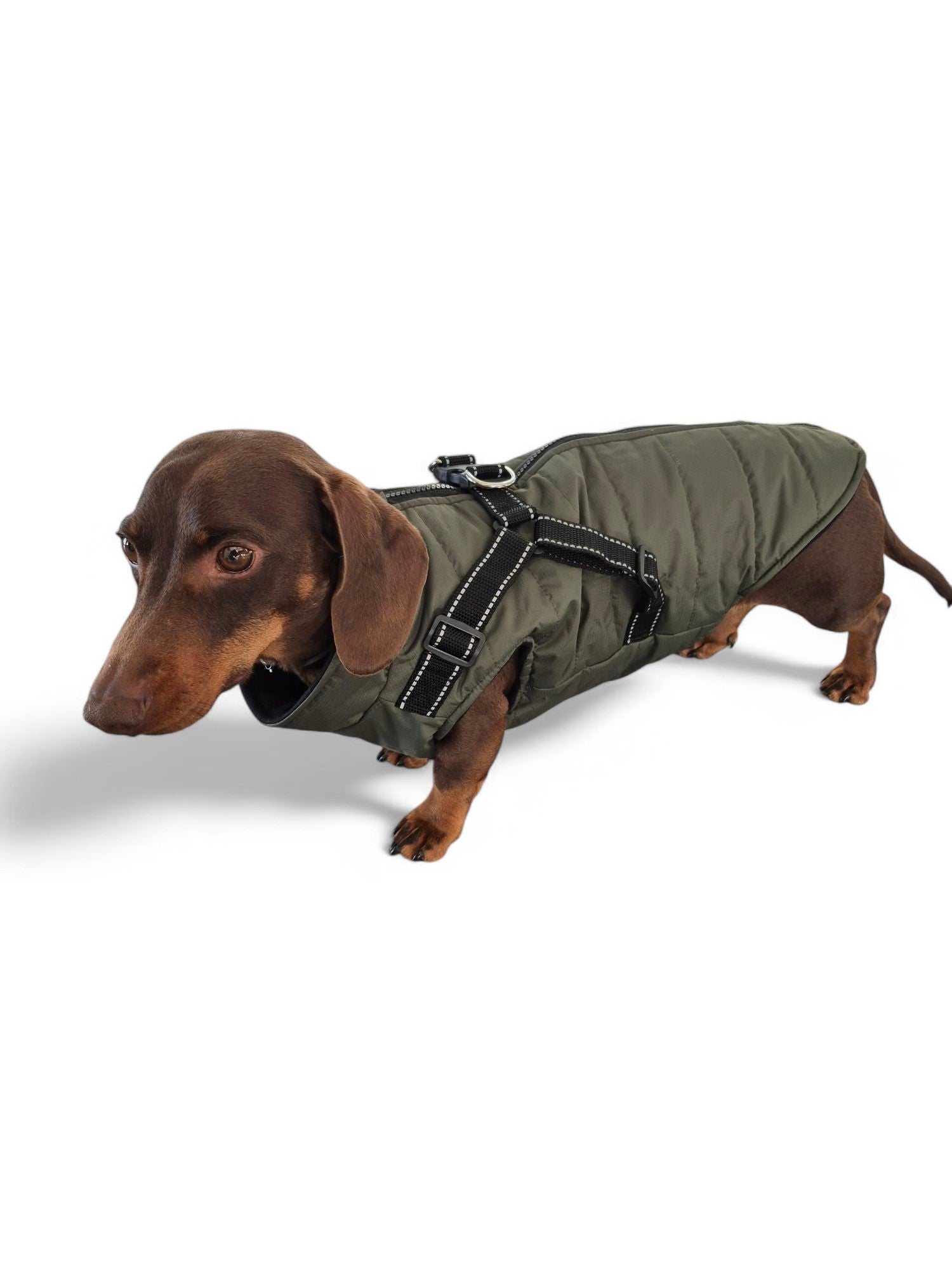 Deze stevige winterjas heeft een geïntegreerd tuig waardoor je teckel geen extra tuigje nodig heeft. De reflecterende strepen zorgen voor betere zichtbaarheid in het donker. Door de rits aan rugzijde is de jas gemakkelijk aan en uit te trekken.