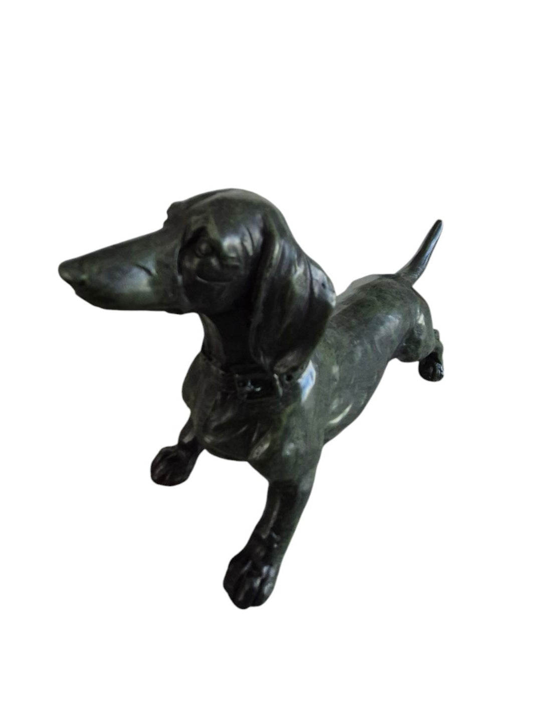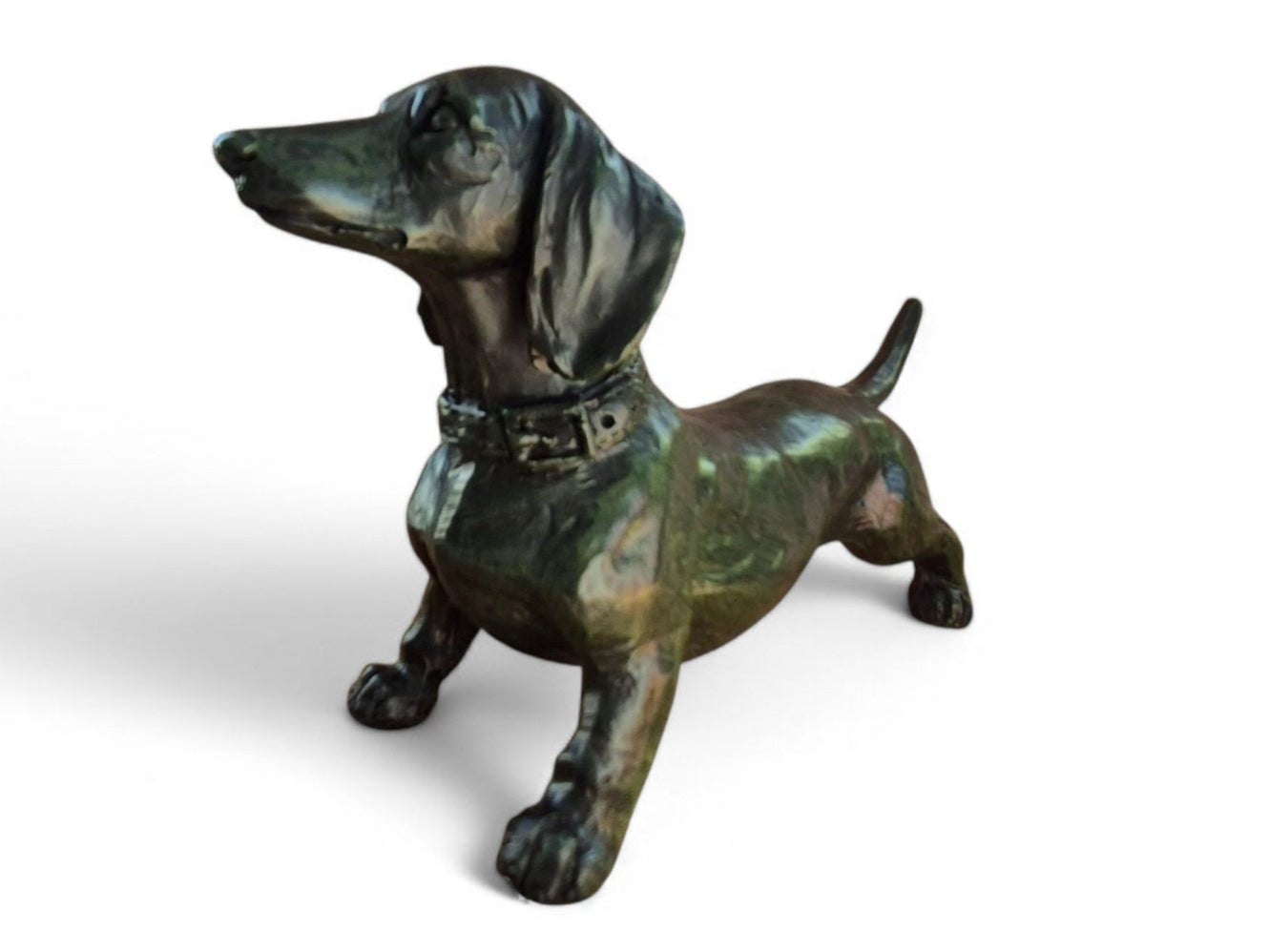 Dit beeldje is een must-have voor teckelfans en past in ieder interieur. Het laat precies zien hoe een echte teckel in elkaar zit: stoer, gedreven en krachtig. Leuk om te geven, maar nog leuker om zelf te houden ;) Zet je 'em op een lichte plek, dan lijkt hij meer donkergroen. Op een donkere plek oogt het beeldje zwart. Gemaakt van stevig materiaal, grootte 18x10 cm.