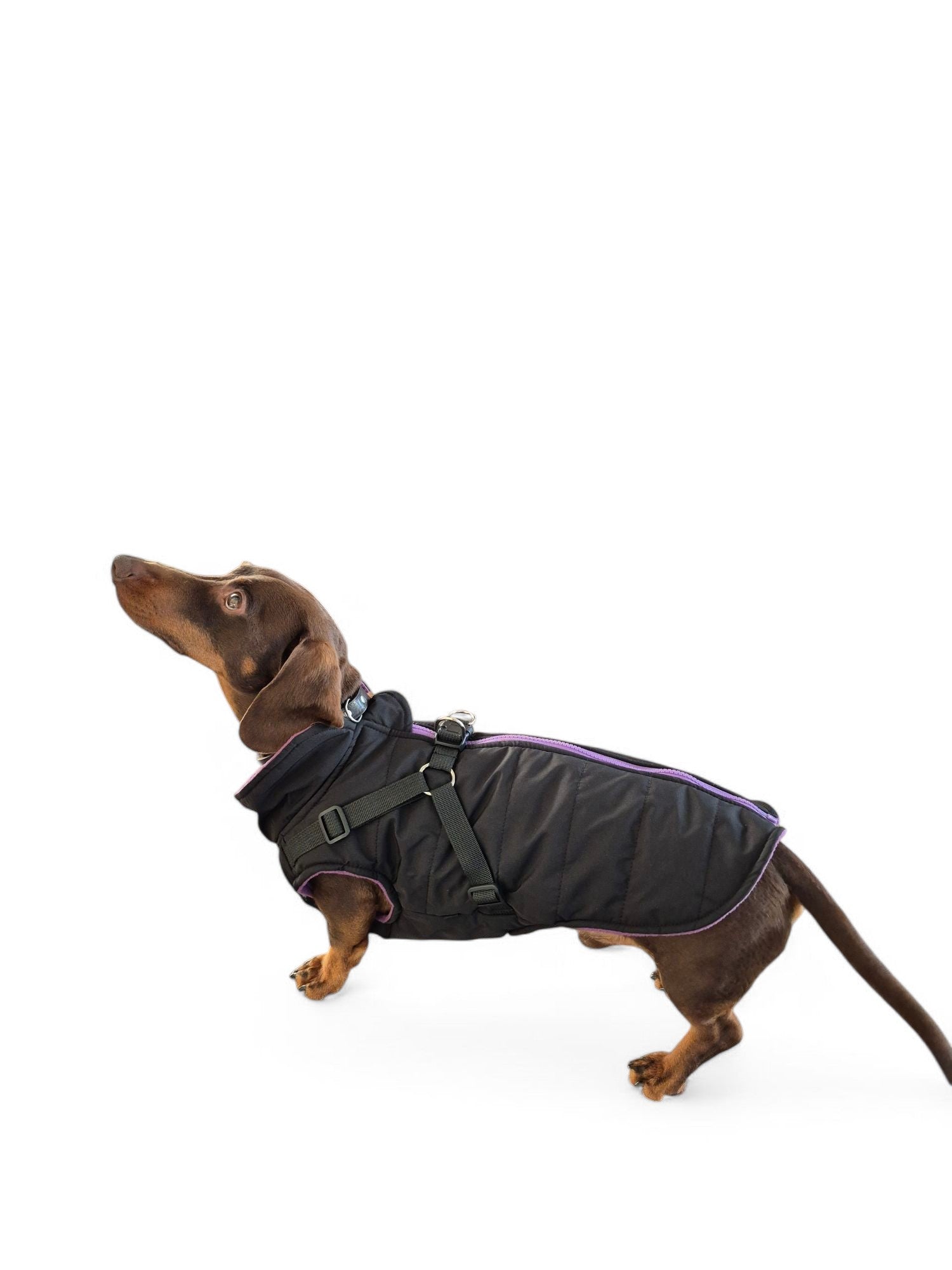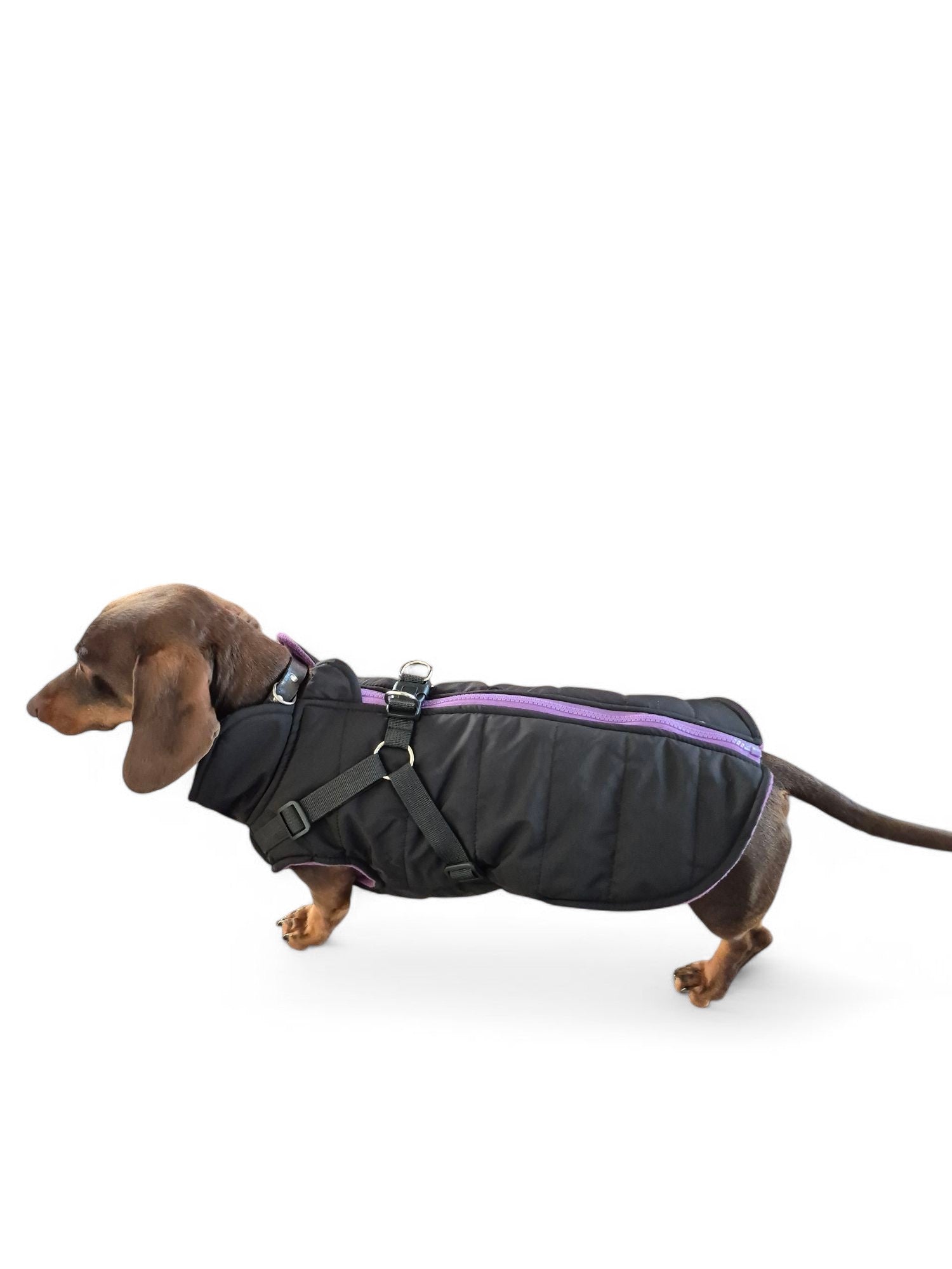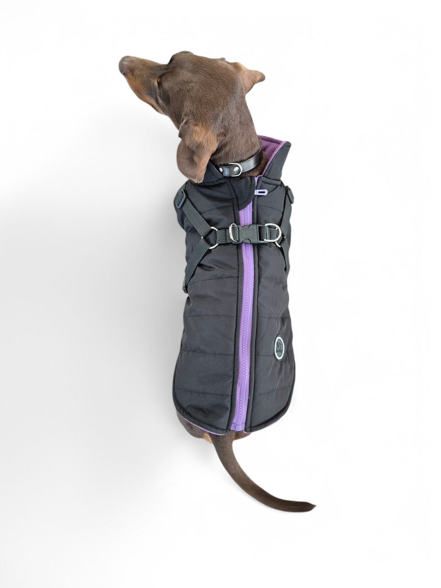 Deze jas is waterdicht en lekker warm door de fleecevoering. Door het tuigje dat aan de jas bevestigd is, heeft je teckel geen extra tuig nodig. Gemakkelijk aan en uit te trekken door de rits aan rugzijde. De jas is er in twee kleuren.
