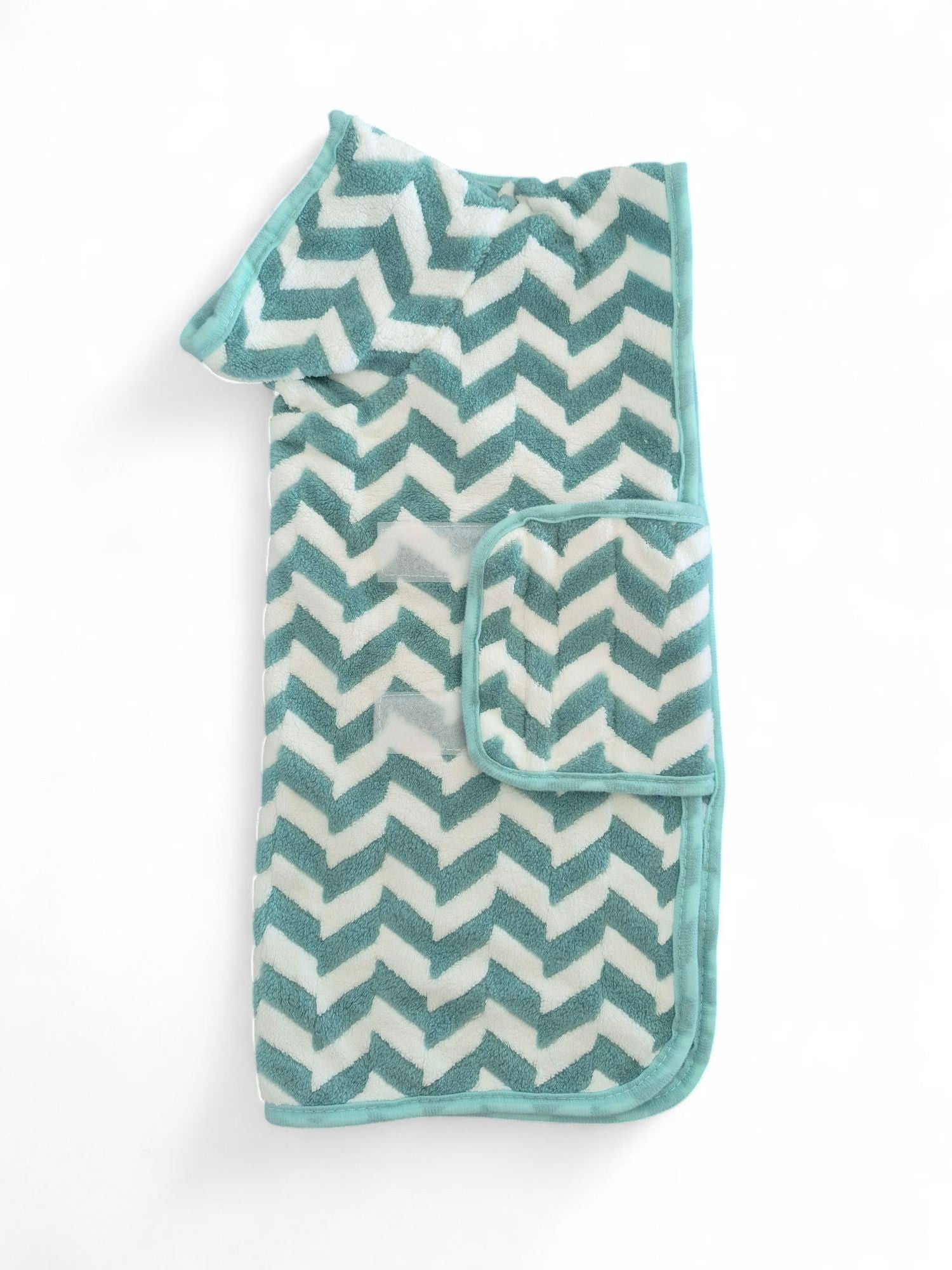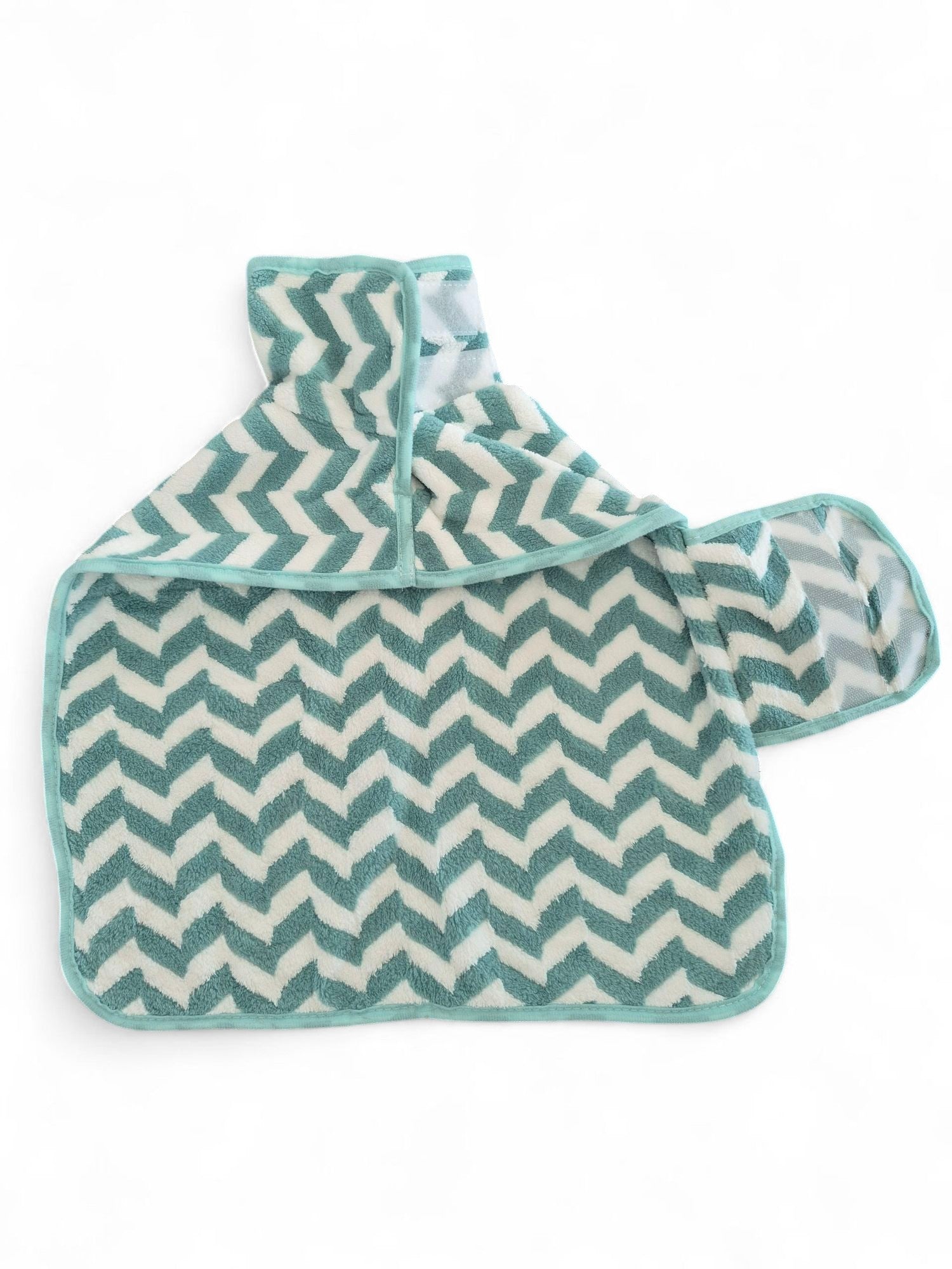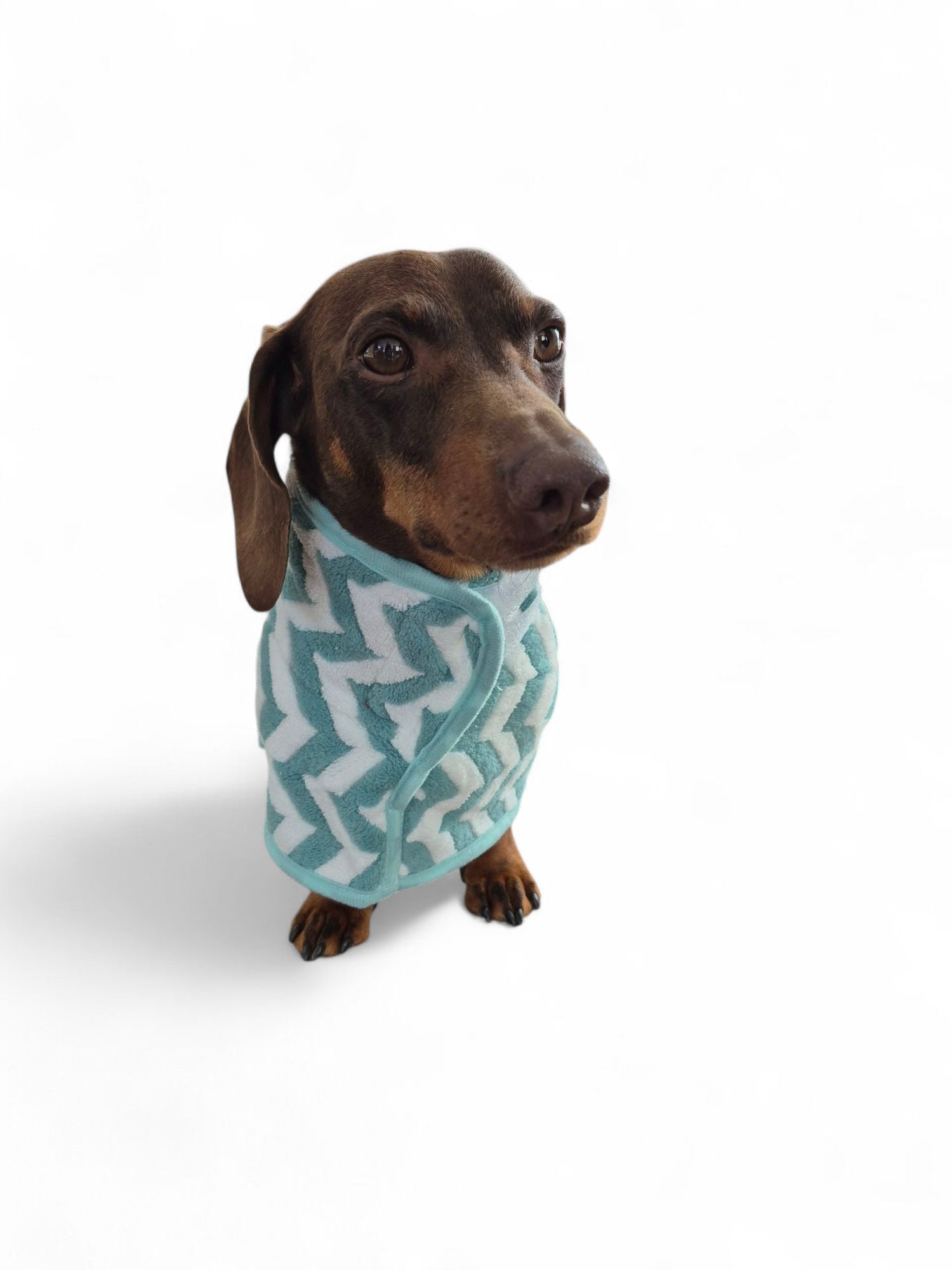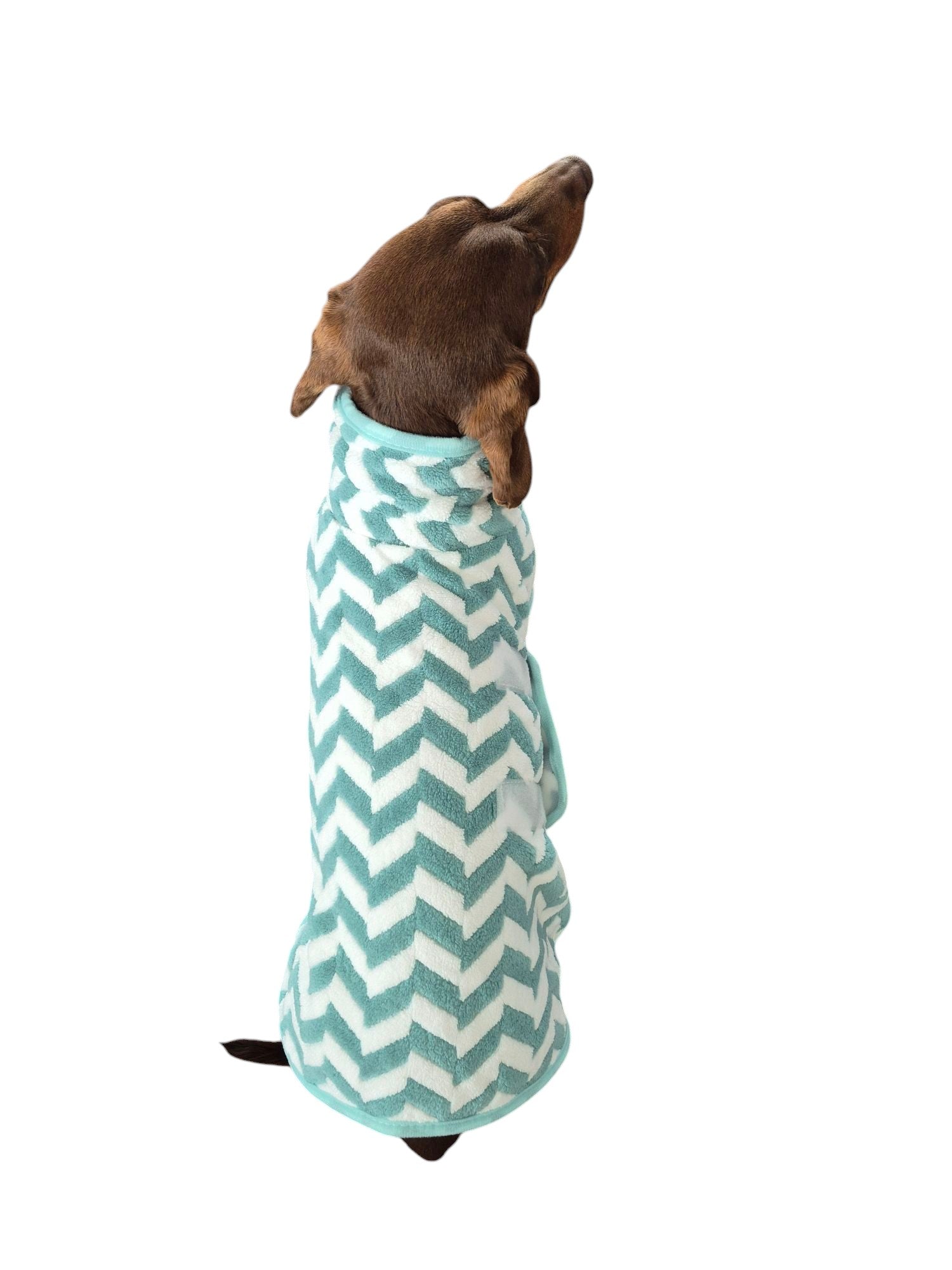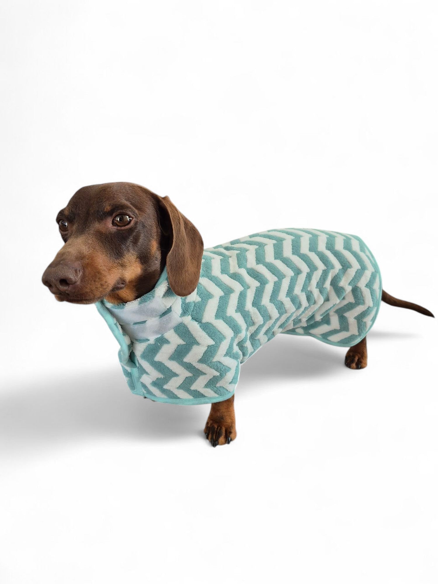 Dit groen-witte badjasje voor de dwerg- of standaardteckel valt vast goed in de smaak na het badderen. Heerlijk warm en zacht opdrogen voor je geliefde vriendje. Zowel bij de hals als onder de buik bevindt zich klittenband om het badjasje vast te zetten.