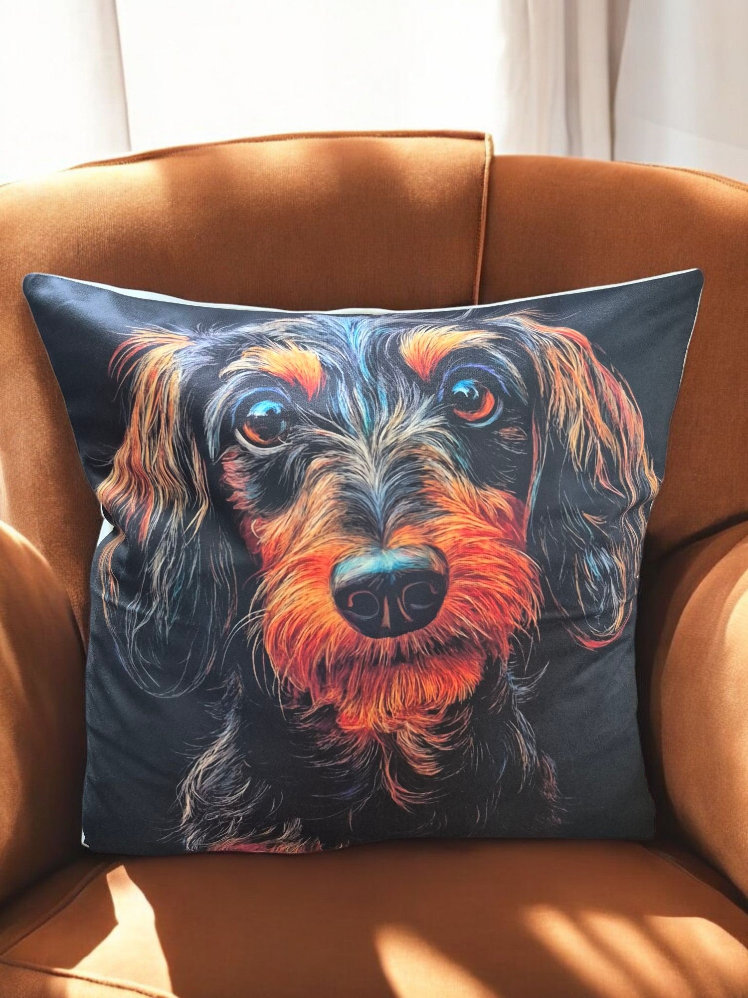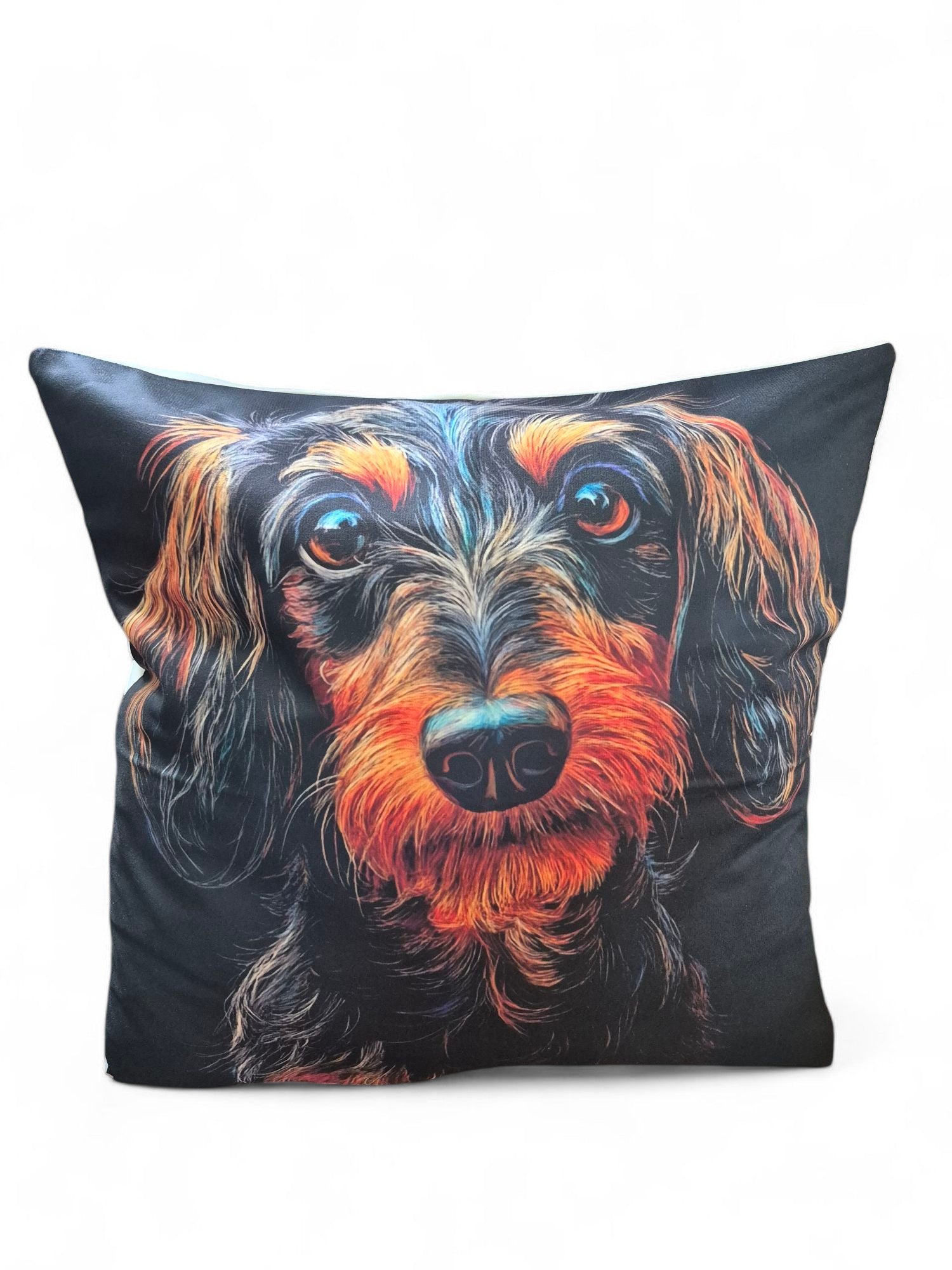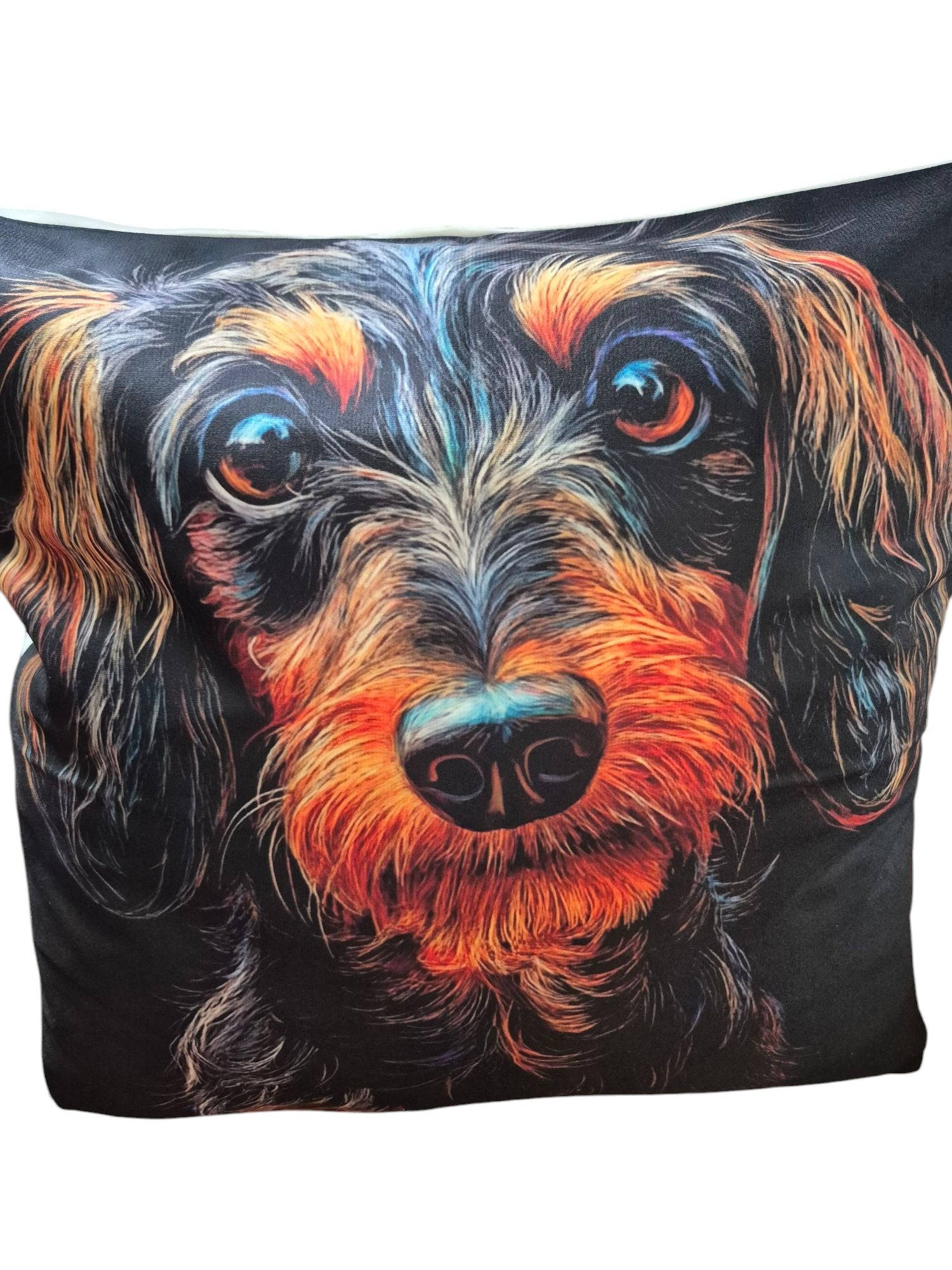 Dit mooie teckel sierkussen staat prachtig in iedere woonkamer. De heldere kleuren laten deze ruwhaar extra goed uitkomen. De stof is ook nog eens heerlijk zacht, zodat je er lekker tegenaan kunt kruipen.