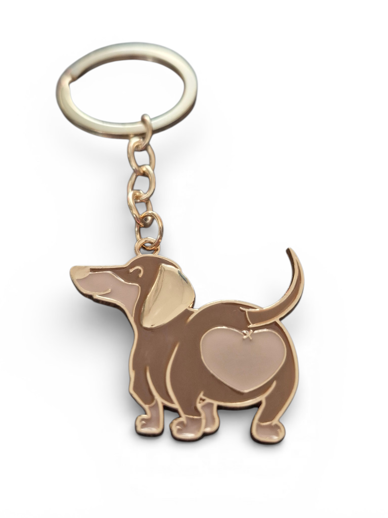 Deze metalen sleutelhanger met vrolijke teckel prijkt straks mooi aan jouw sleutelbos! Verkrijgbaar in één kleur: een chocotan teckeltje met goudkleurige sleutelhanger. De achterkant is goudkleurig.