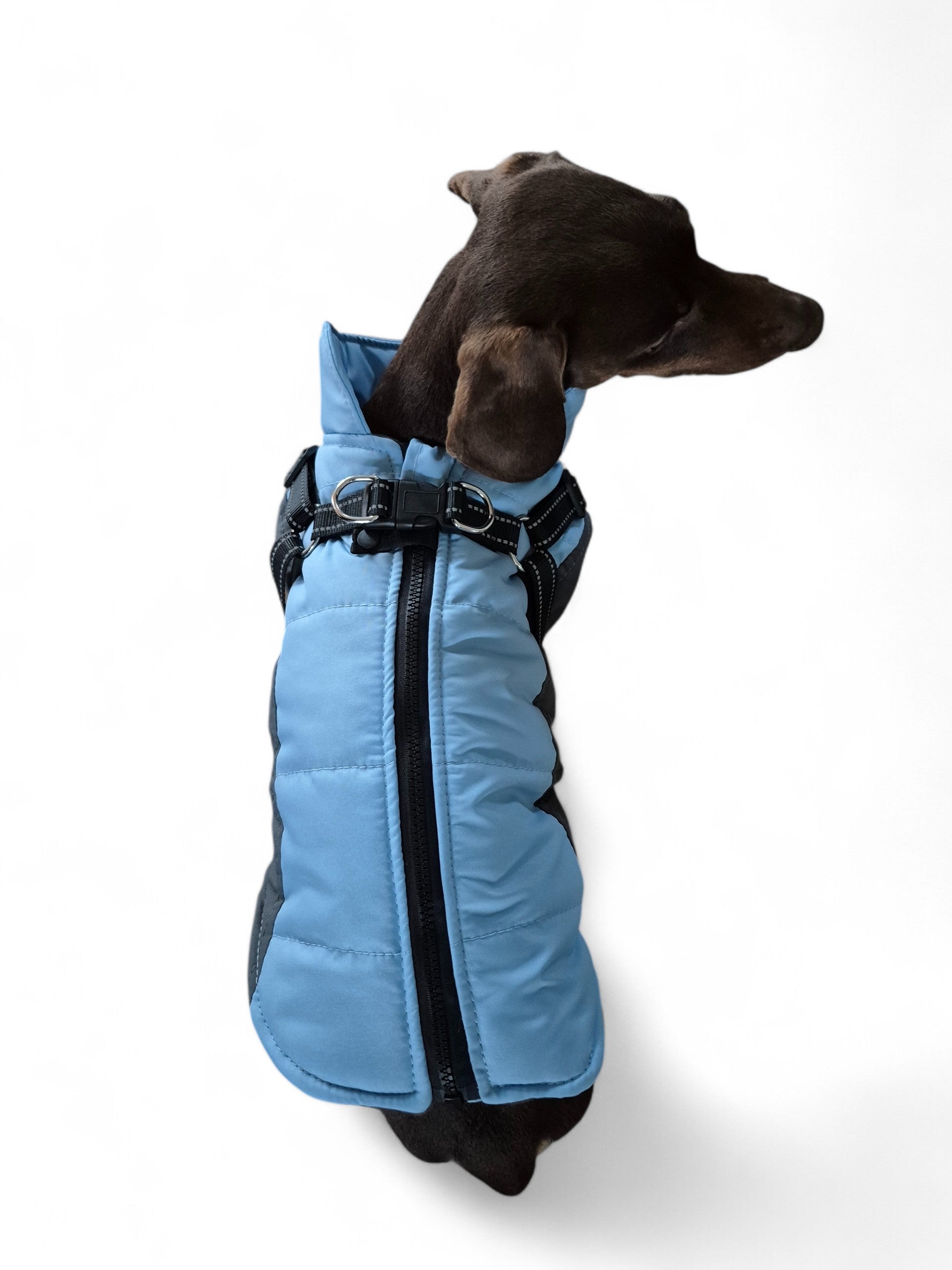 Deze mooie teckeljas houdt jouw kleine vriendje lekker warm. De jas sluit goed aan om de buik en heeft een geïntegreerd tuig, zodat je geen extra tuigje hoeft te gebruiken. De jas is gemakkelijk aan en uit te trekken, door de rits aan rugzijde.