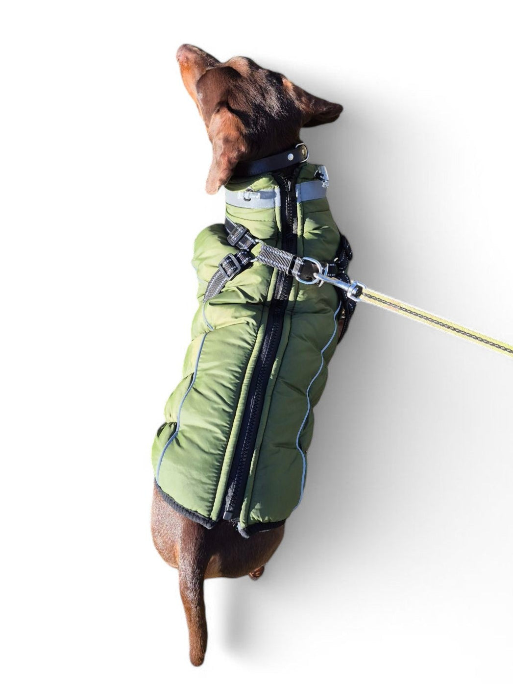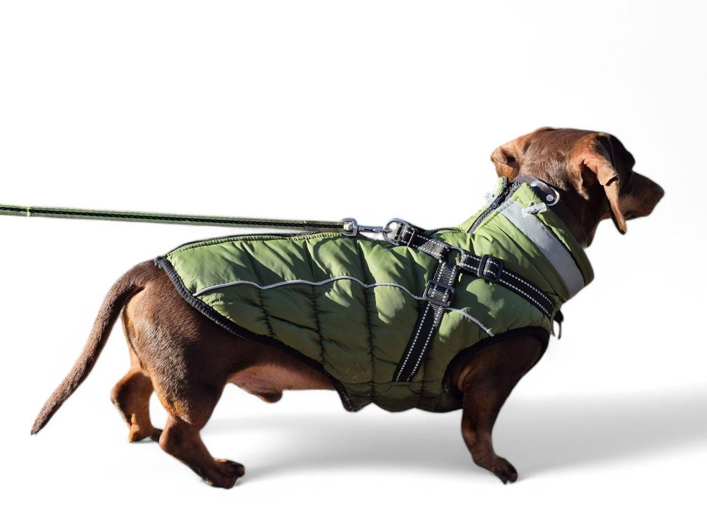 Dit jasje is ideaal voor de winterse dagen! Door de dubbele lagen stof rondom het lichaam en hoge kraag, krijgt jouw teckel het nooit koud. Tevens is de jas waterdicht.