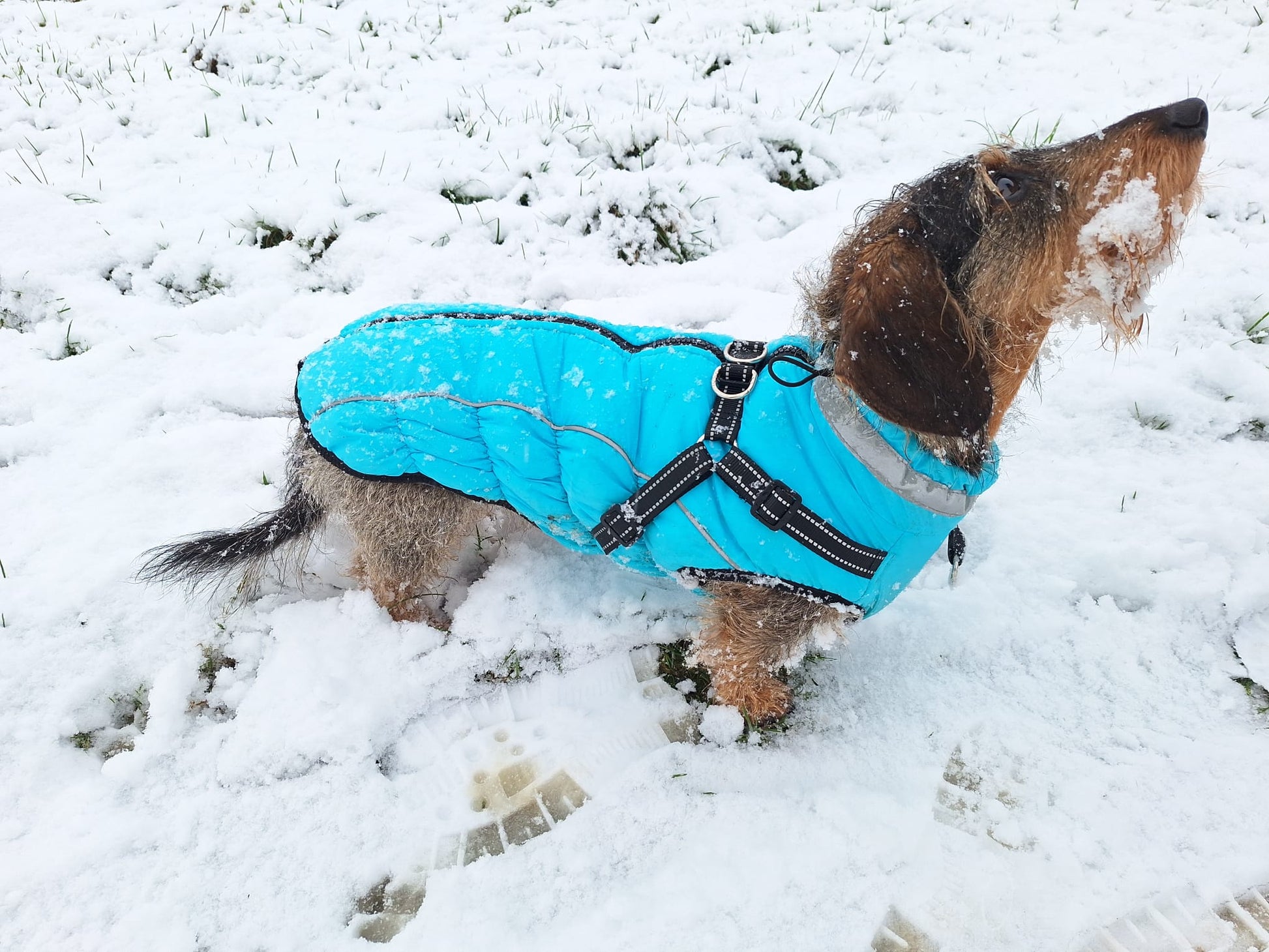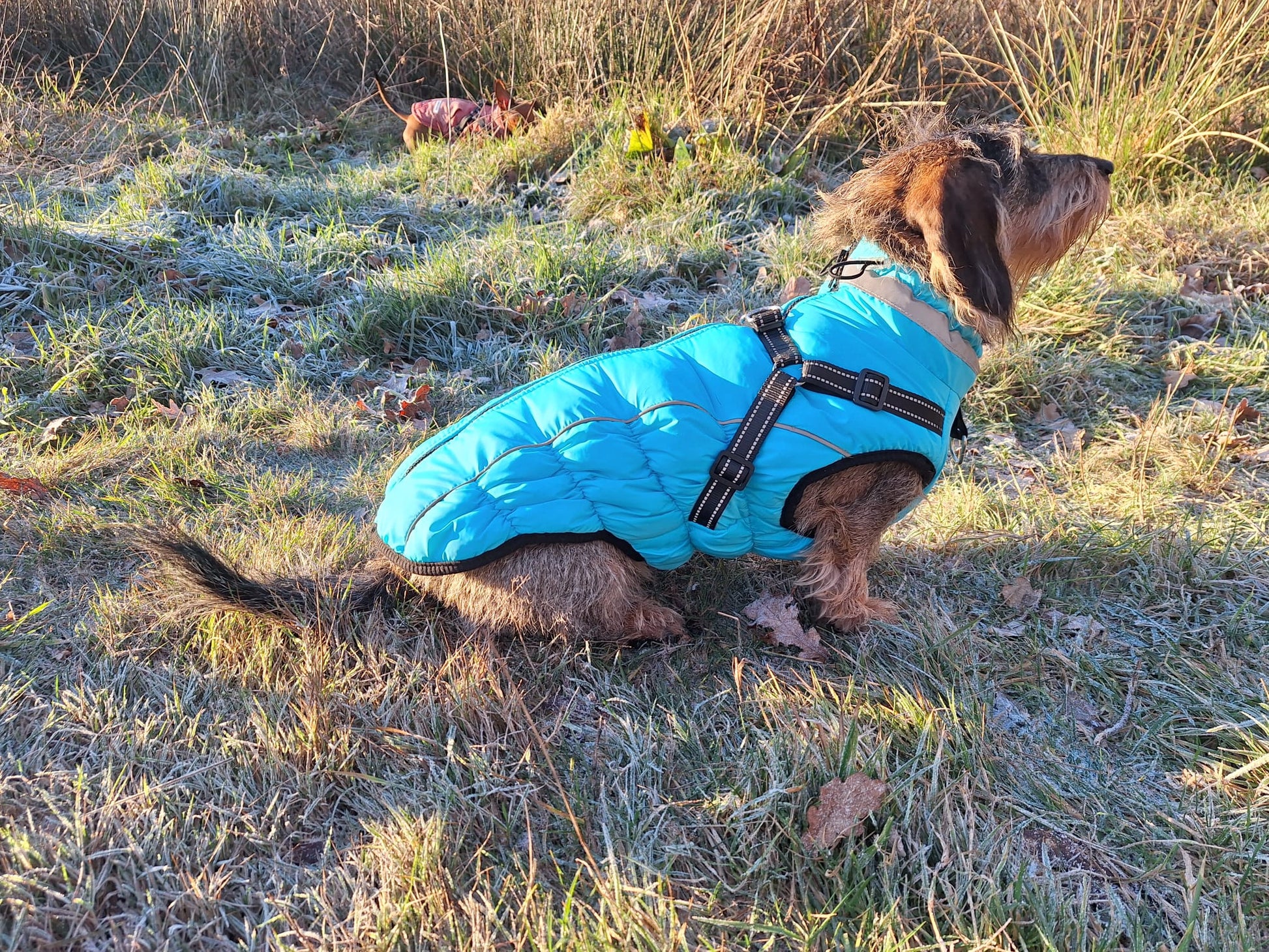 Deze jas is ideaal voor de winterse dagen! Door de dubbele lagen stof rondom het lichaam en hoge kraag, krijgt jouw teckel het nooit koud. Tevens is de jas waterdicht.