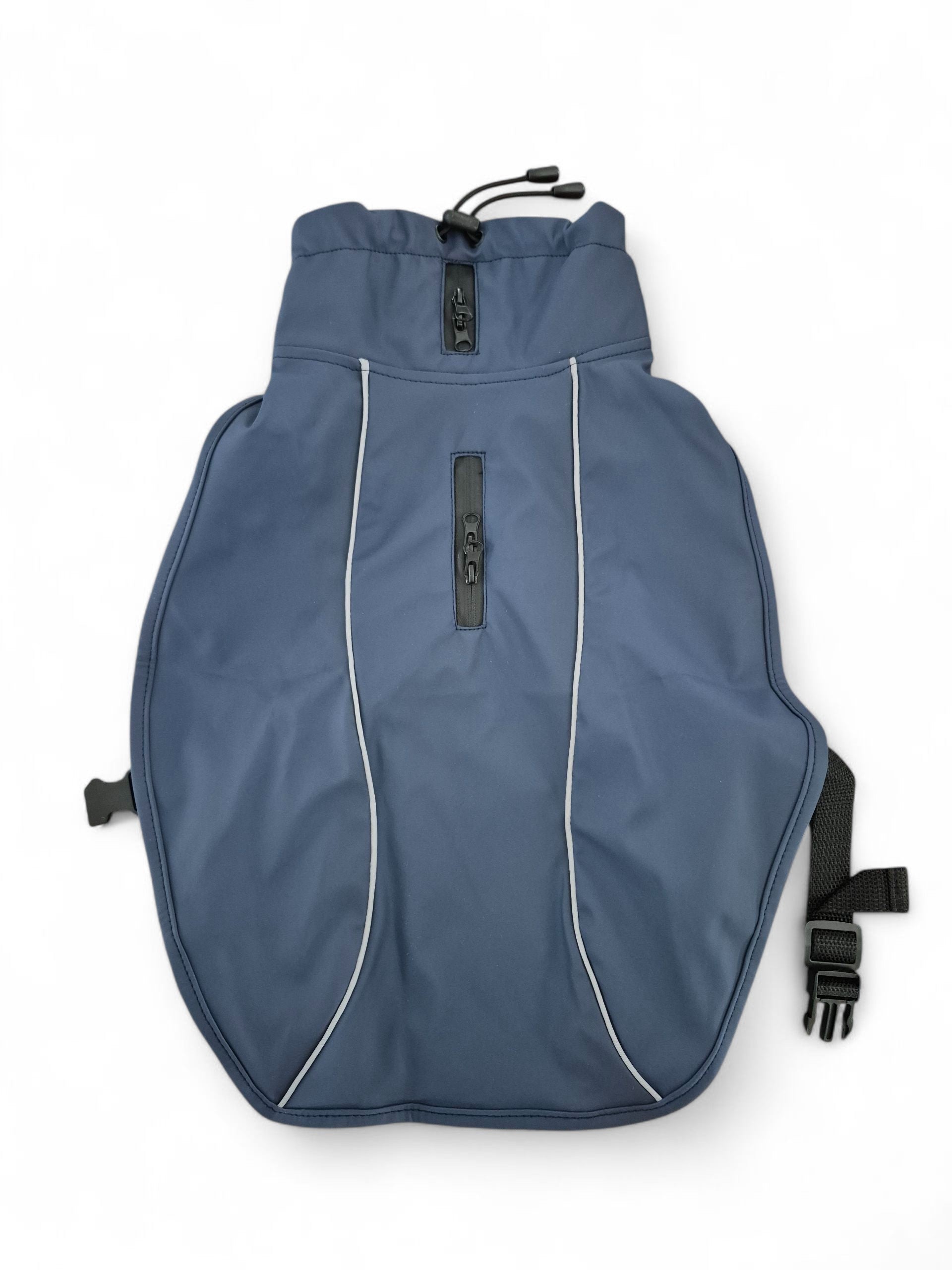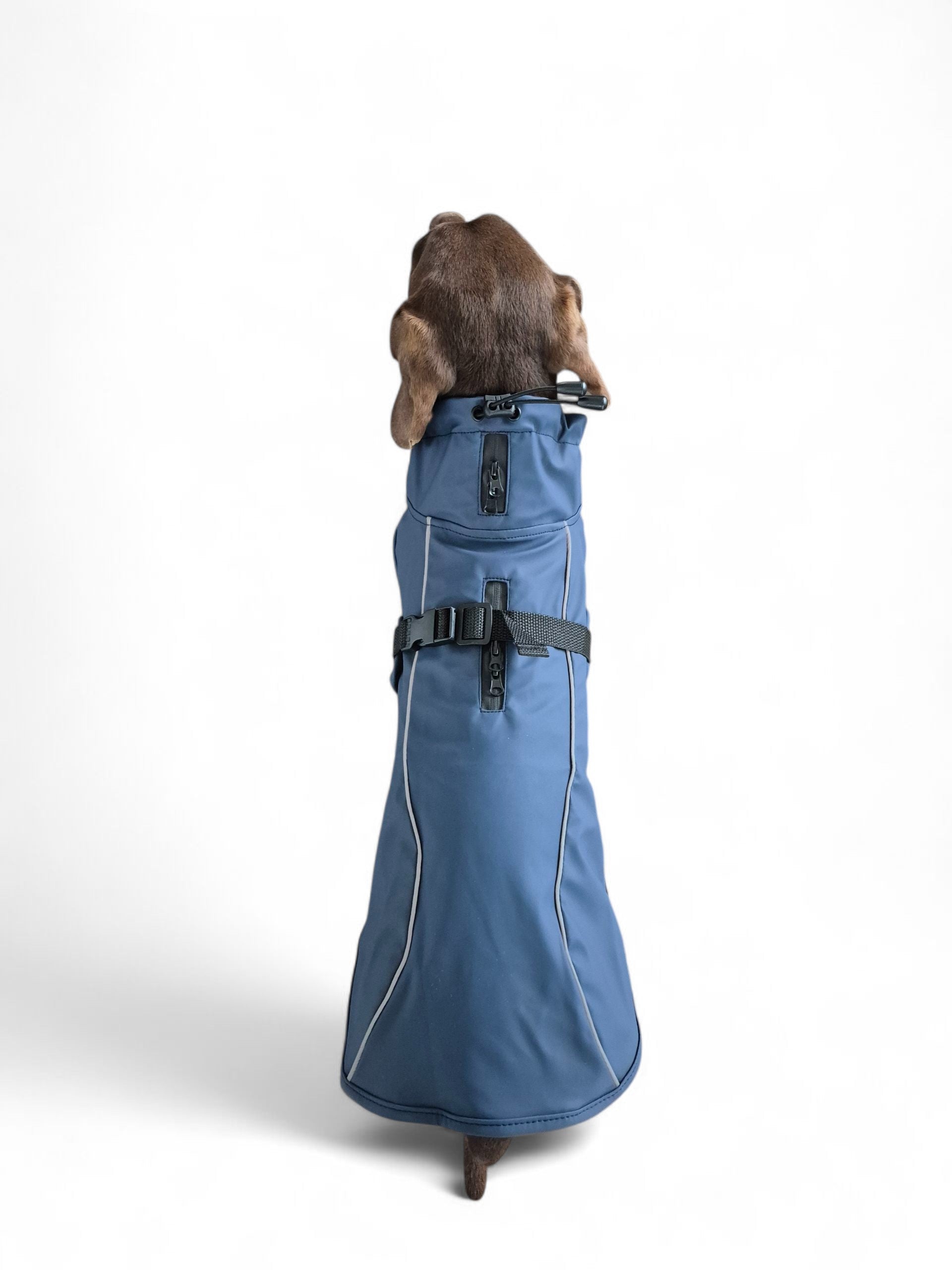 Deze mooie regenjas voor dwerg- en standaard teckels zal de uitlaatrondjes in de regen een stuk aangenamer maken. De hals en rug worden volledig bedekt, de borst deels. De jas is op twee plekken vast te zetten zodat hij goed blijft zitten: met een clip op de rug en elastieken om de achterpootjes. Op de rug bevindt zich een opening met ritsjes waar de riem doorheen kan. Een eventueel tuig kan onder het jasje worden gedragen.