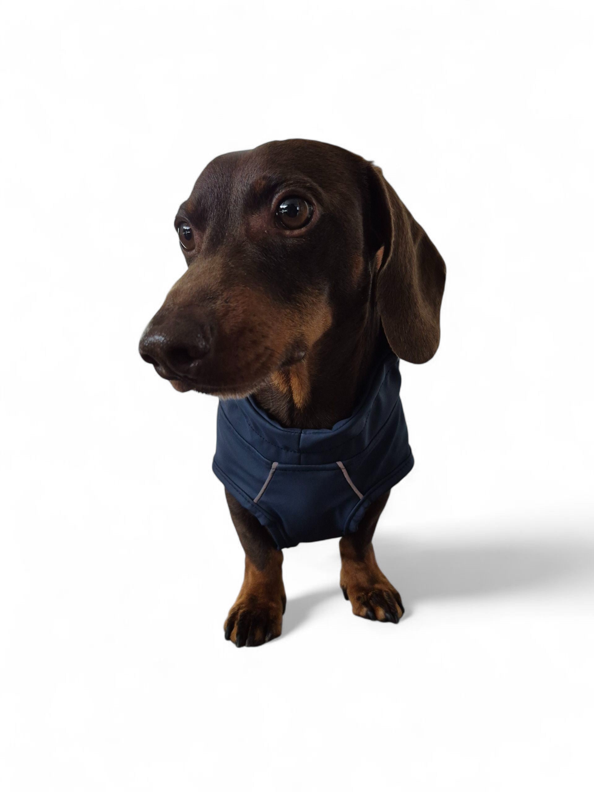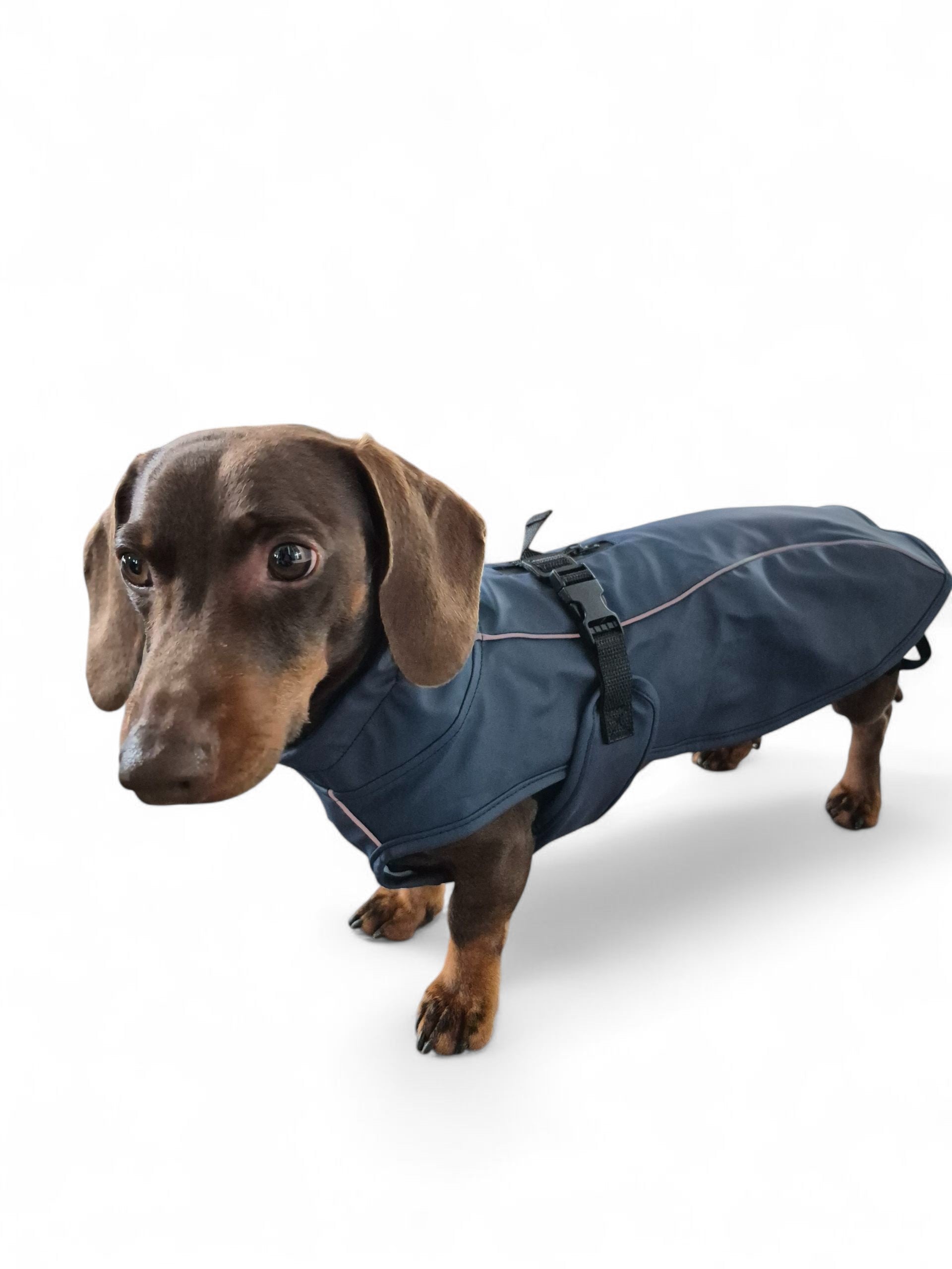 Doordat de band om de middel vrij nauwsluitend is, is het jasje niet geschikt voor vollere teckels.