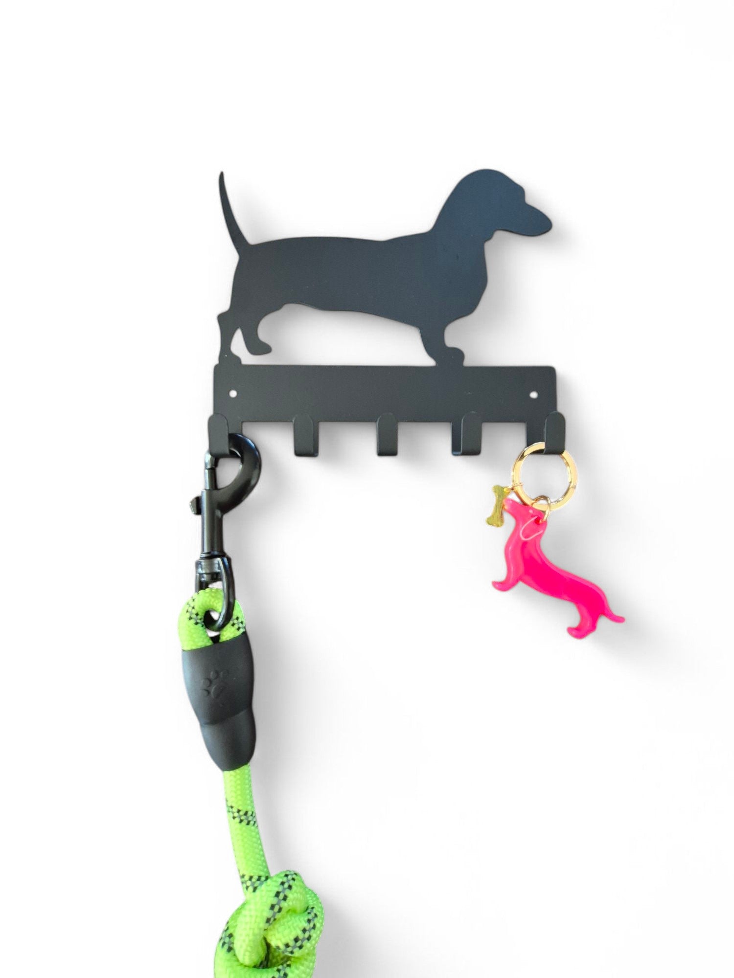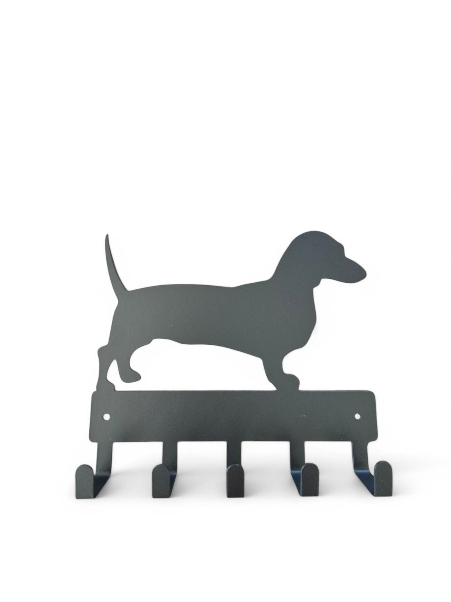 Dit leuke teckelrekje is multifunctioneel: je kunt hem gebruiken voor je handdoeken, als plek om je sleutels gemakkelijk terug te vinden, of om je hondenriem aan op je hangen. Gemaakt van metaal, kleur zwart. Grootte: 15x12 cm.